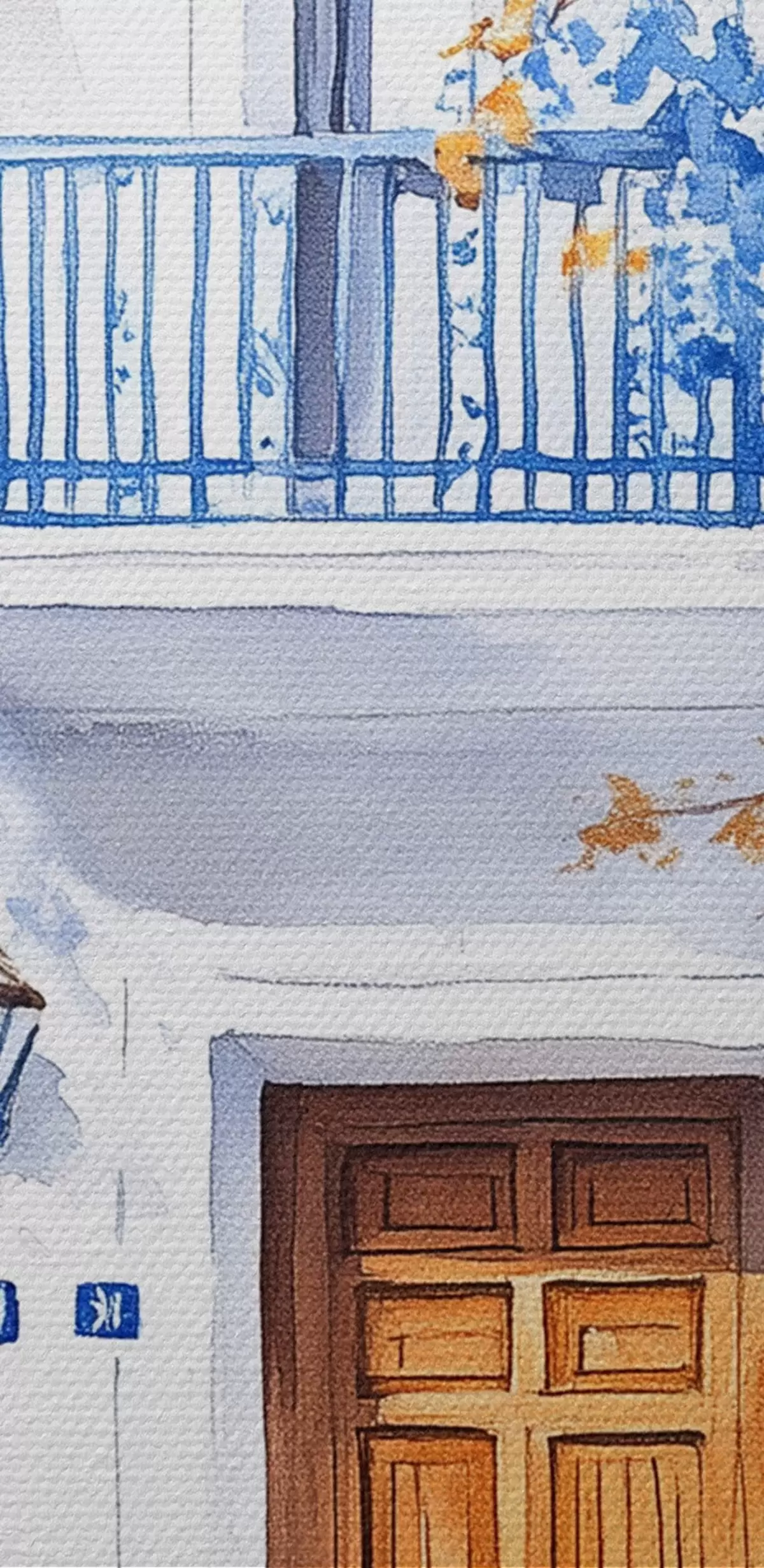 Okrągły obraz Kwitnące drzewo z niebieskimi kwiatami, biały dom, Grecja, styl akwareli Nr r43183