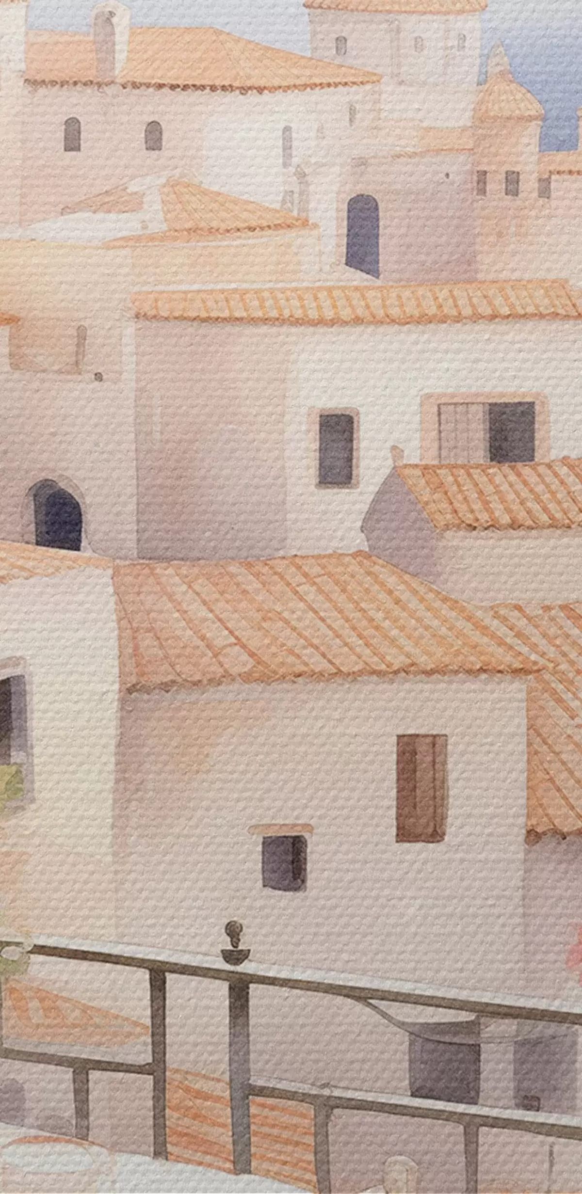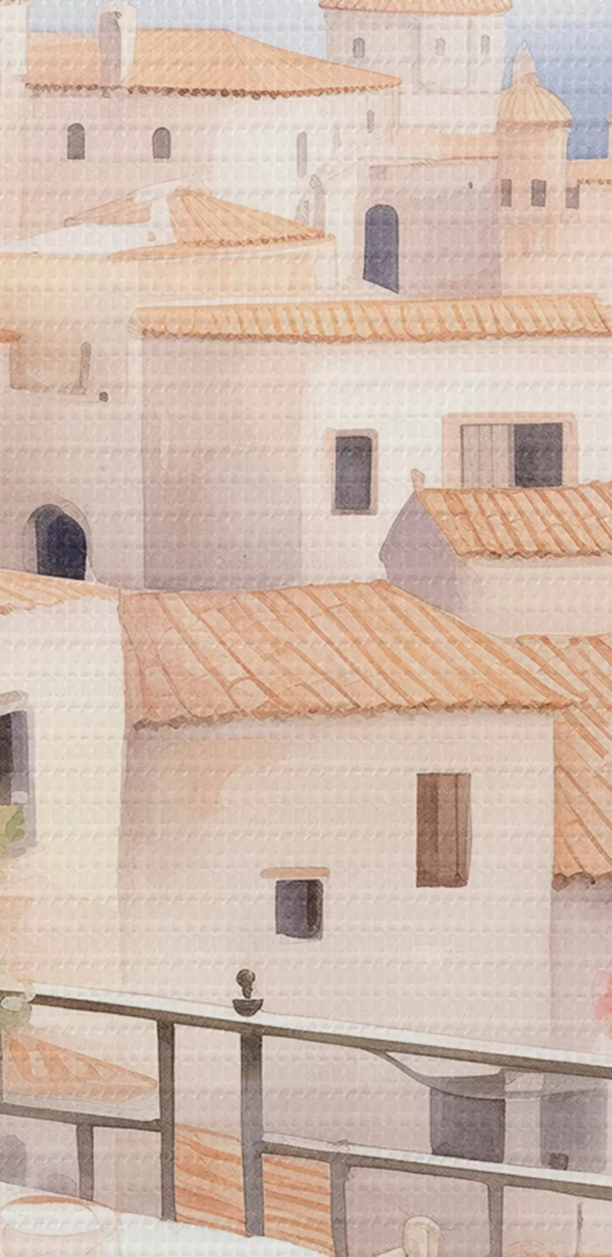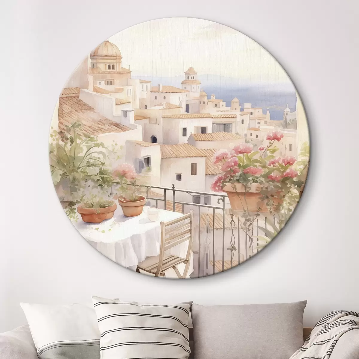 Okrągły obraz Zachód słońca na balkonie, Włochy, architektura, kwitnące kwiaty, styl akwareli Nr r43184