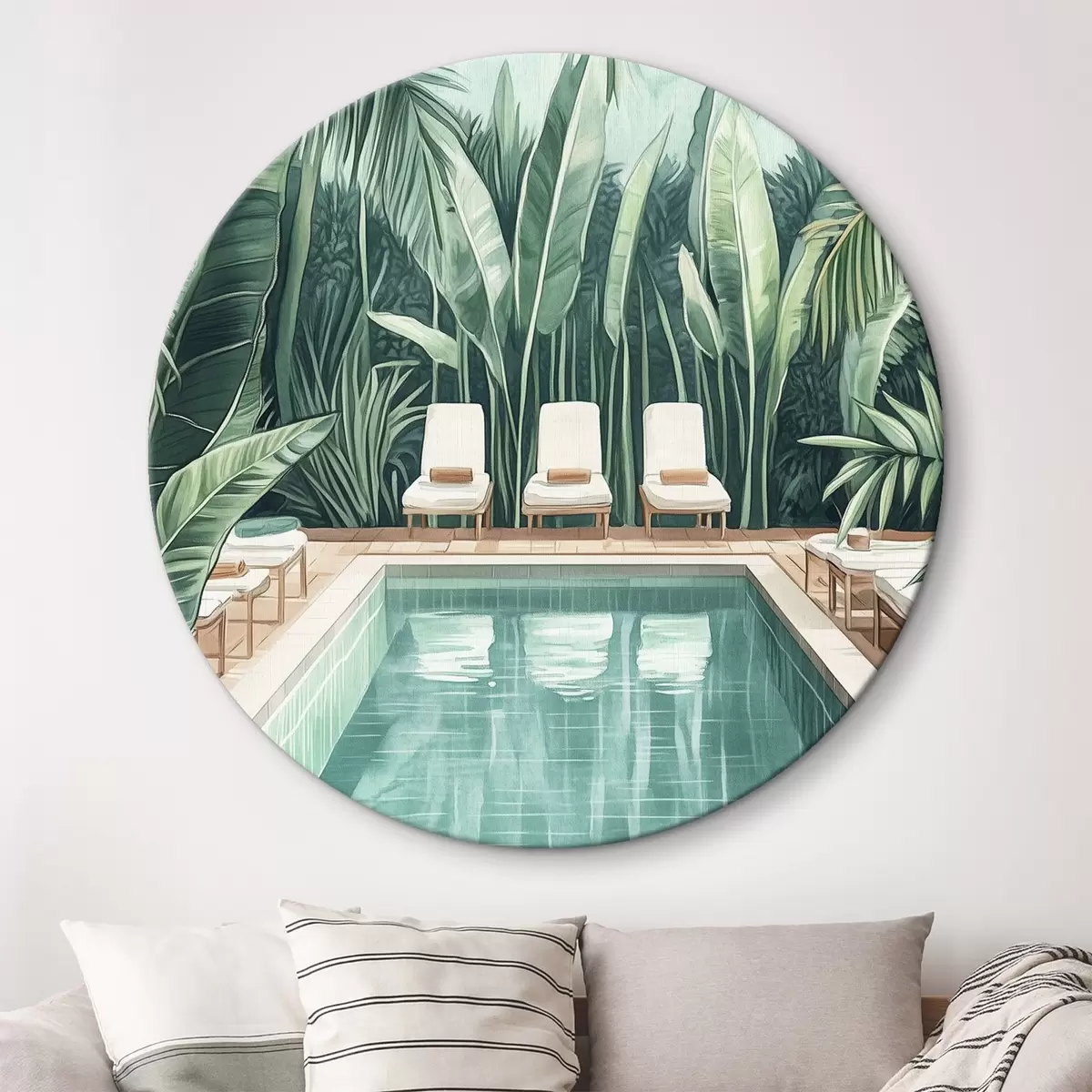 Okrągłe obrazy Estetyczny letni basen w tropikalnym ogrodzie, styl akwareli r43192