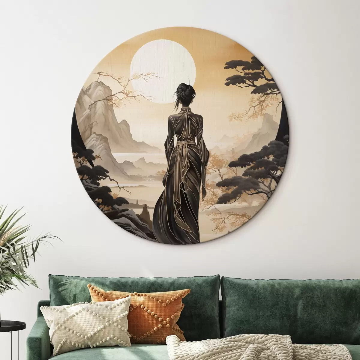 Okrągły obraz Ludzie, Japonia, dziewczyna o zachodzie słońca na tle sakury i gór Nr r43256