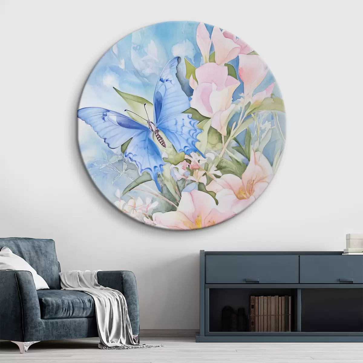 Okrągłe obrazy Niebieski motyl i różowe kwiaty r43296