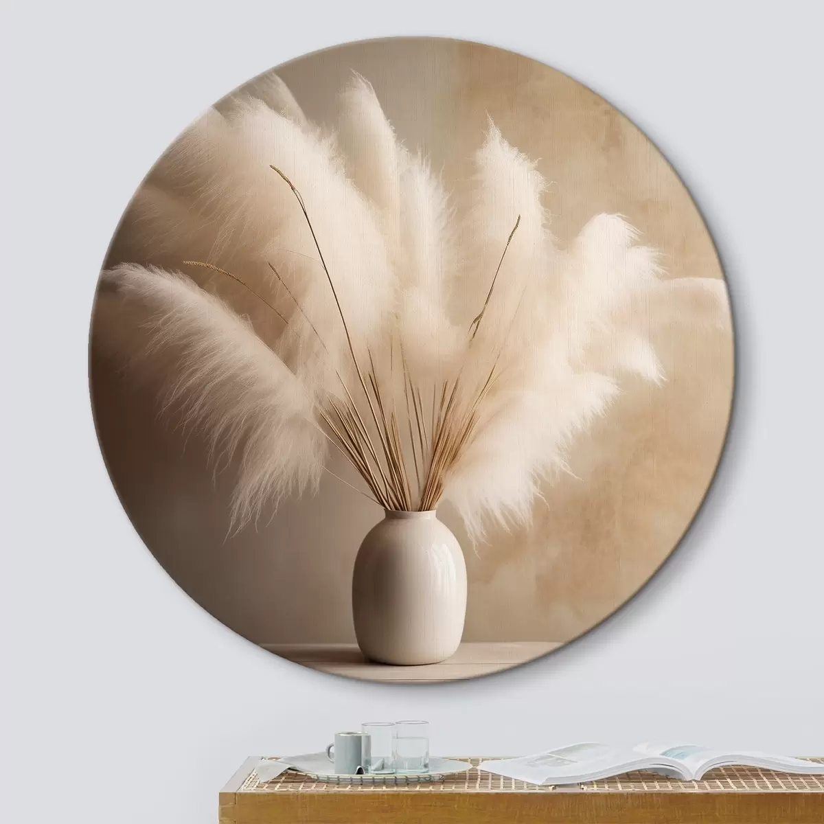 Okrągłe obrazy Puszyste gałązki trzciny w wazonie na stole r43338