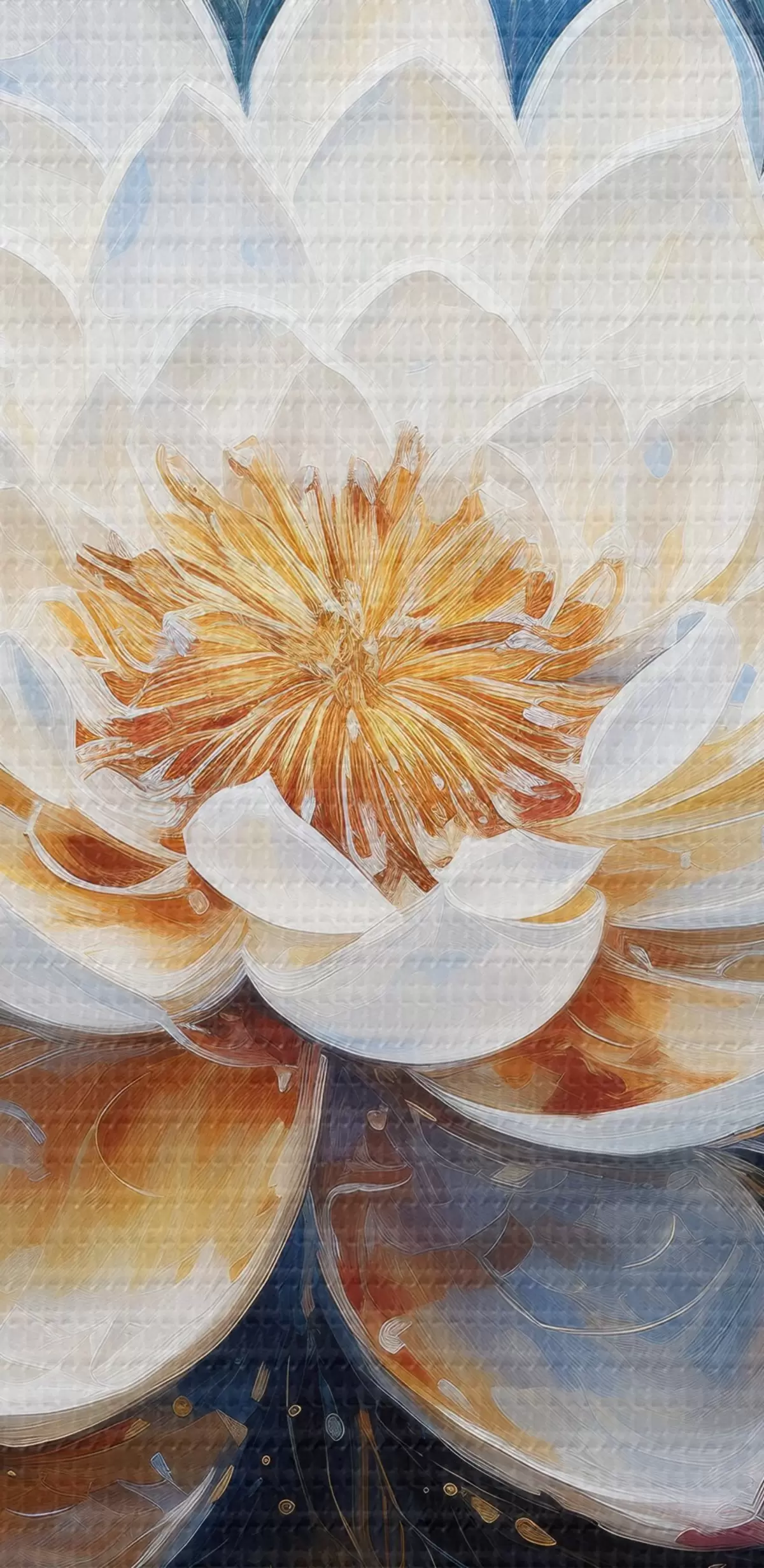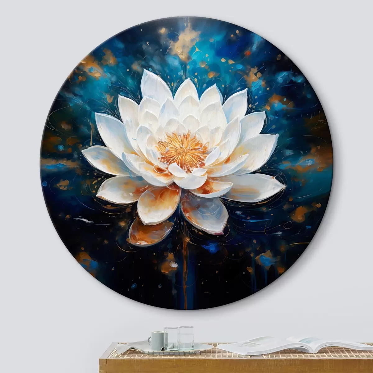 Okrągły obraz Biały lotos na niebieskim tle w stylu malarskim Nr r43371
