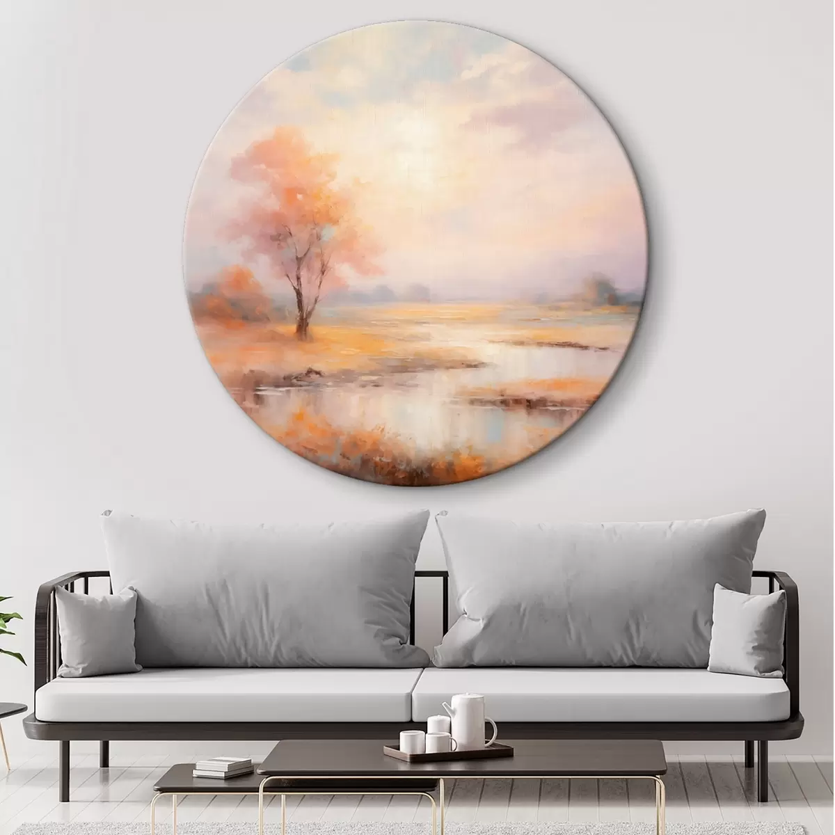 Okrągły obraz Krajobraz w ciepłych odcieniach z rzeką i drzewem Nr r43375