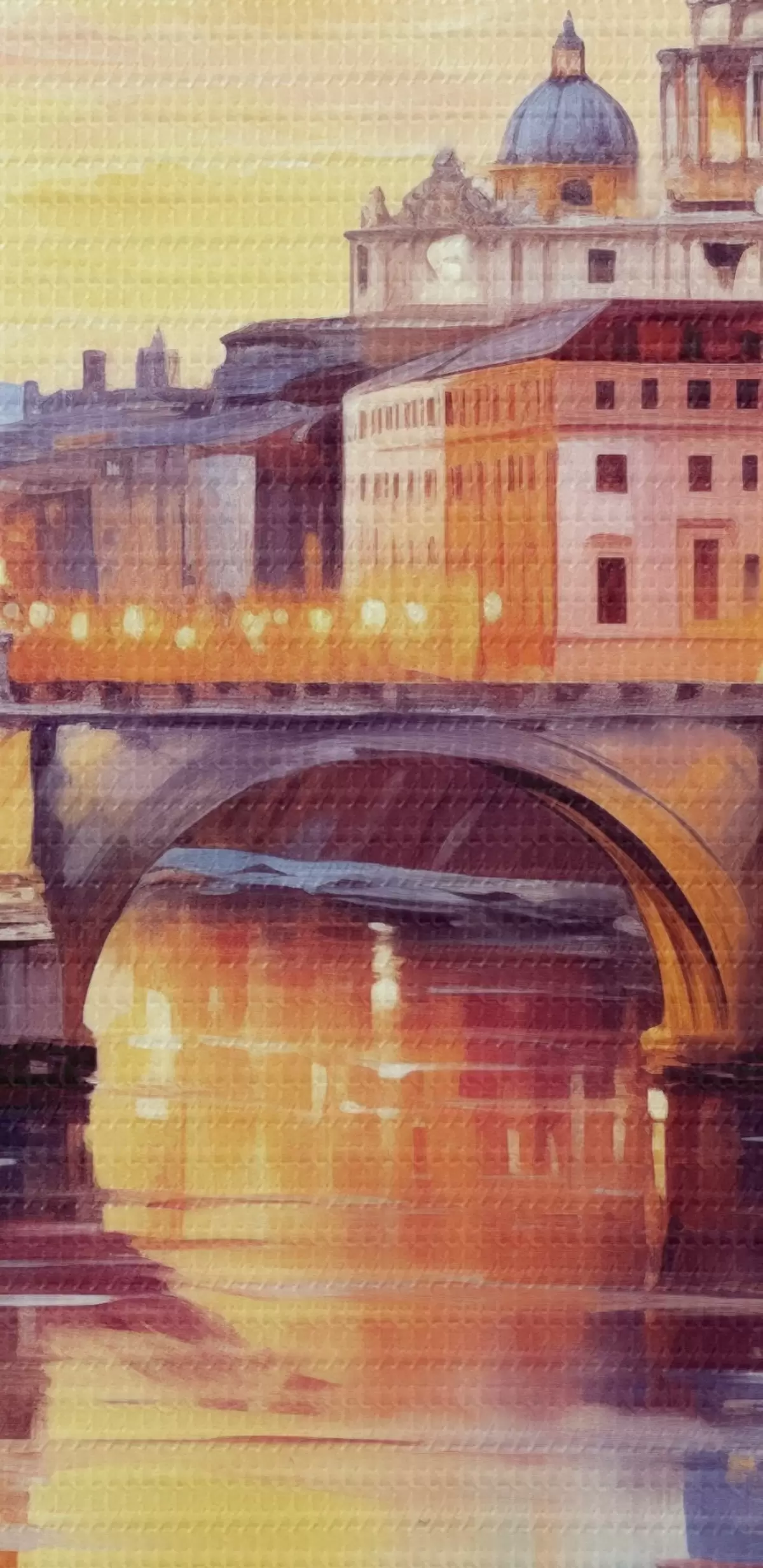 Okrągłe obrazy Bazylika Świętego Piotra i most nad rzeką o zachodzie słońca, ciepłe kolory, odbicie w wodzie, styl malarstwa olejnego r43396
