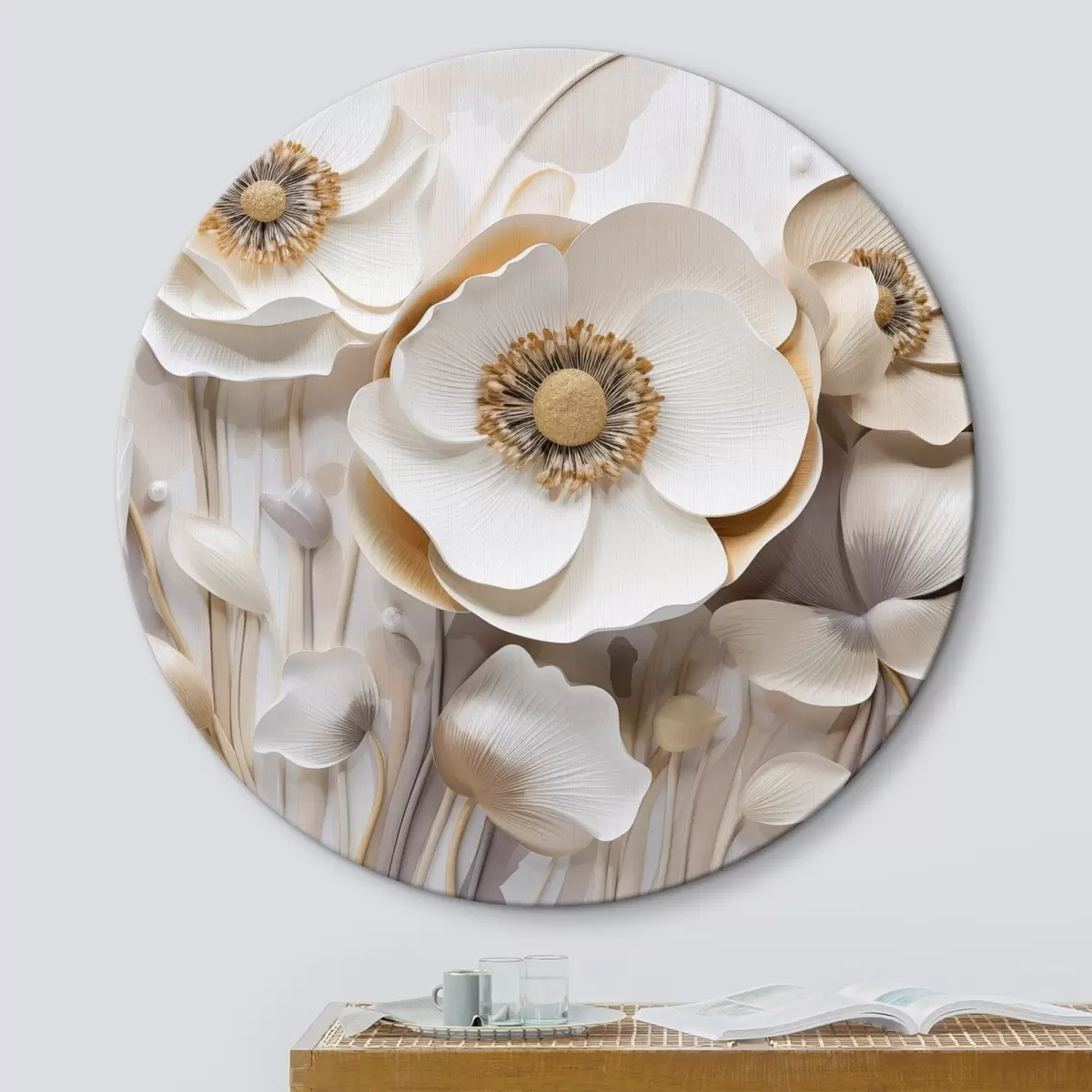 Okrągły obraz Białe kwiaty anemonu z żółtymi środkami, z minimalistycznym tłem, tworzące delikatny kwiatowy wzór Nr r43400