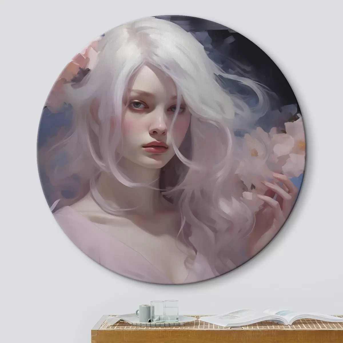 Okrągły obraz Dziewczyna z piwoniami, rysunek akrylowy, ciemne tło Nr r43496