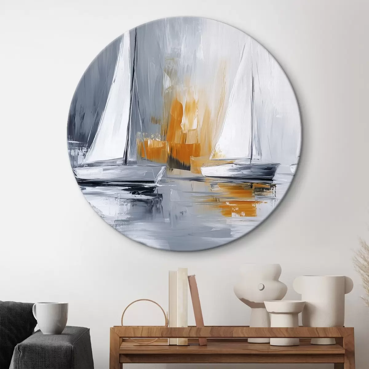 Okrągły obraz Żaglówki, abstrakcja, rysunek akrylowy, szary i pomarańczowy Nr r43499