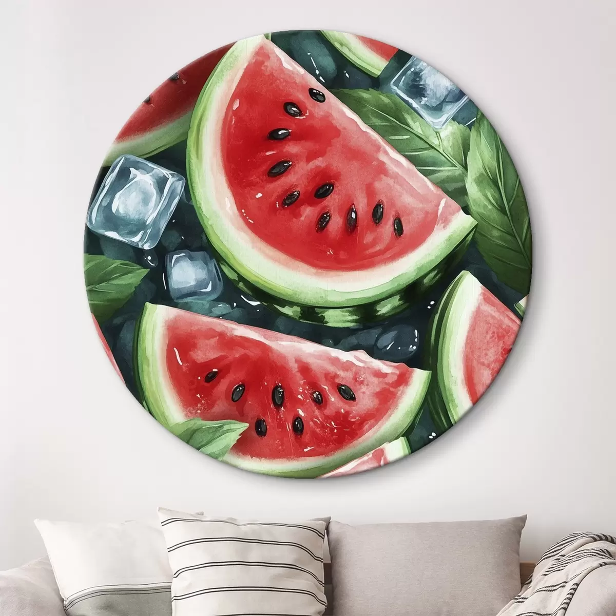 Okrągły obraz Plastry arbuza z kostkami lodu i miętą, styl akwareli Nr r43880