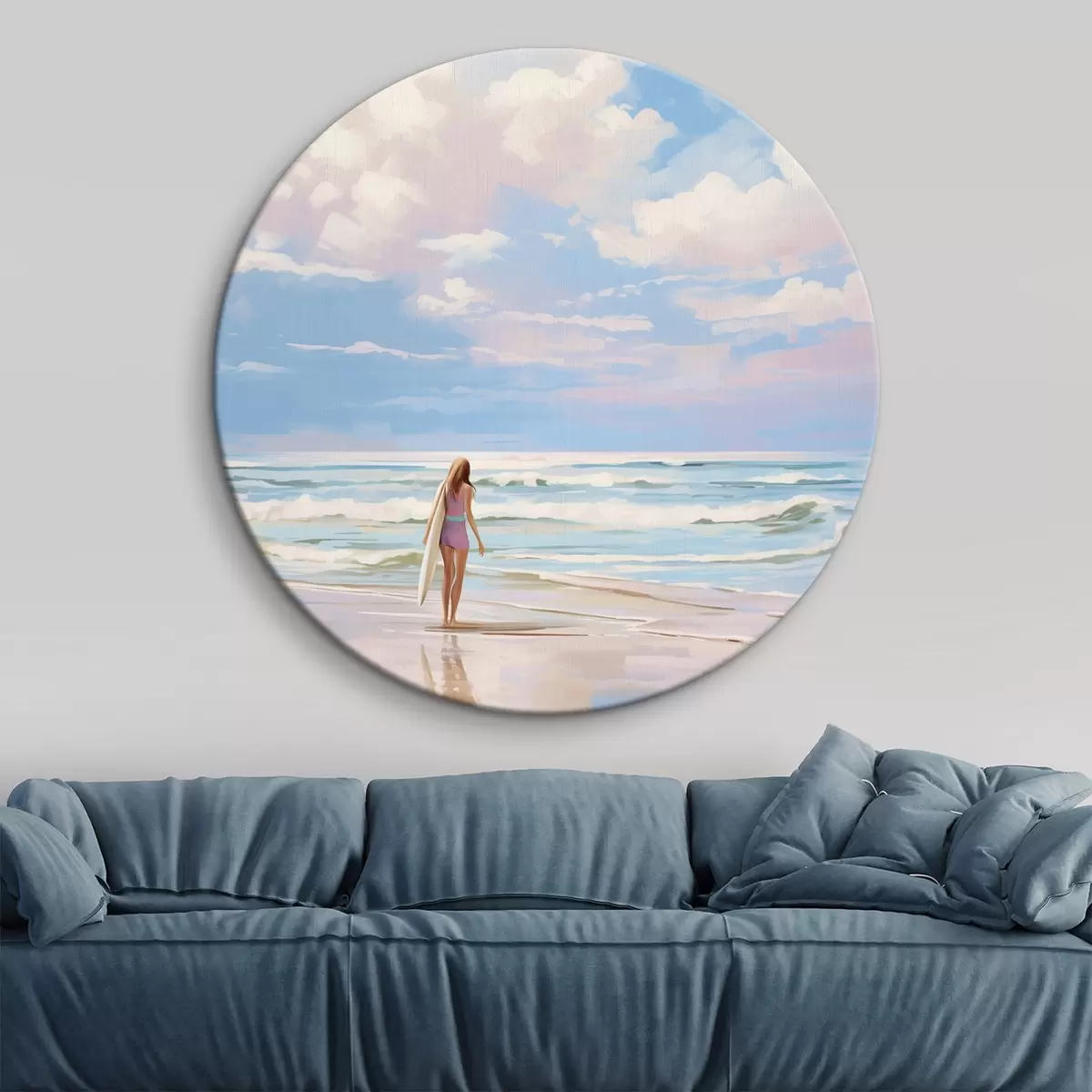 Okrągły obraz Dziewczyna surfująca w oceanie, lato, fale, styl akrylowy Nr r43882