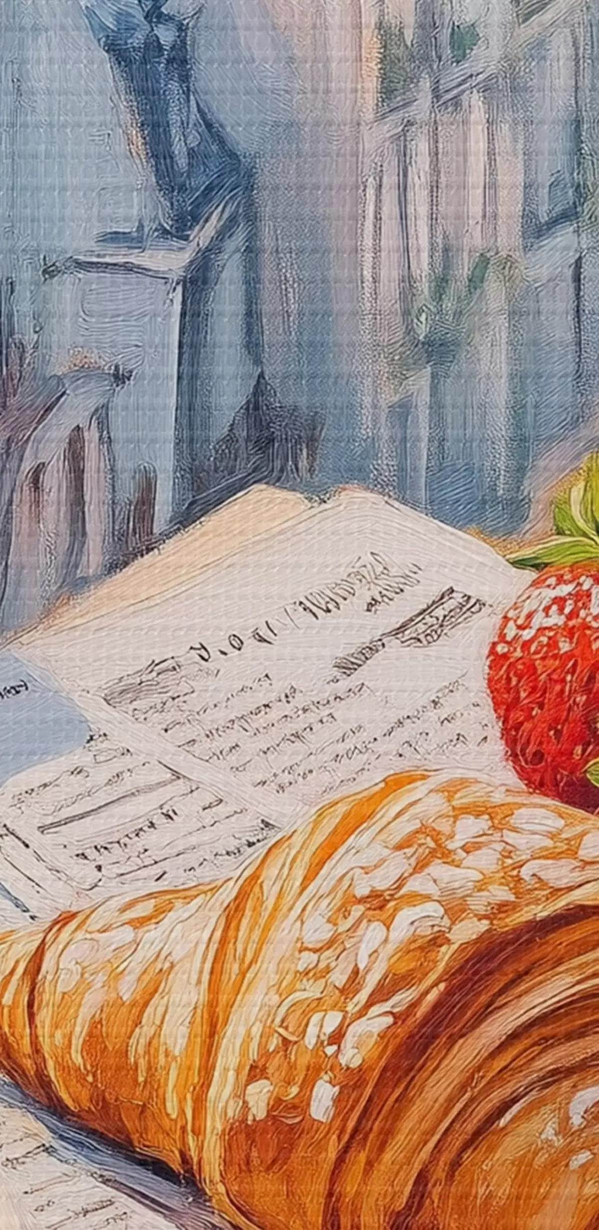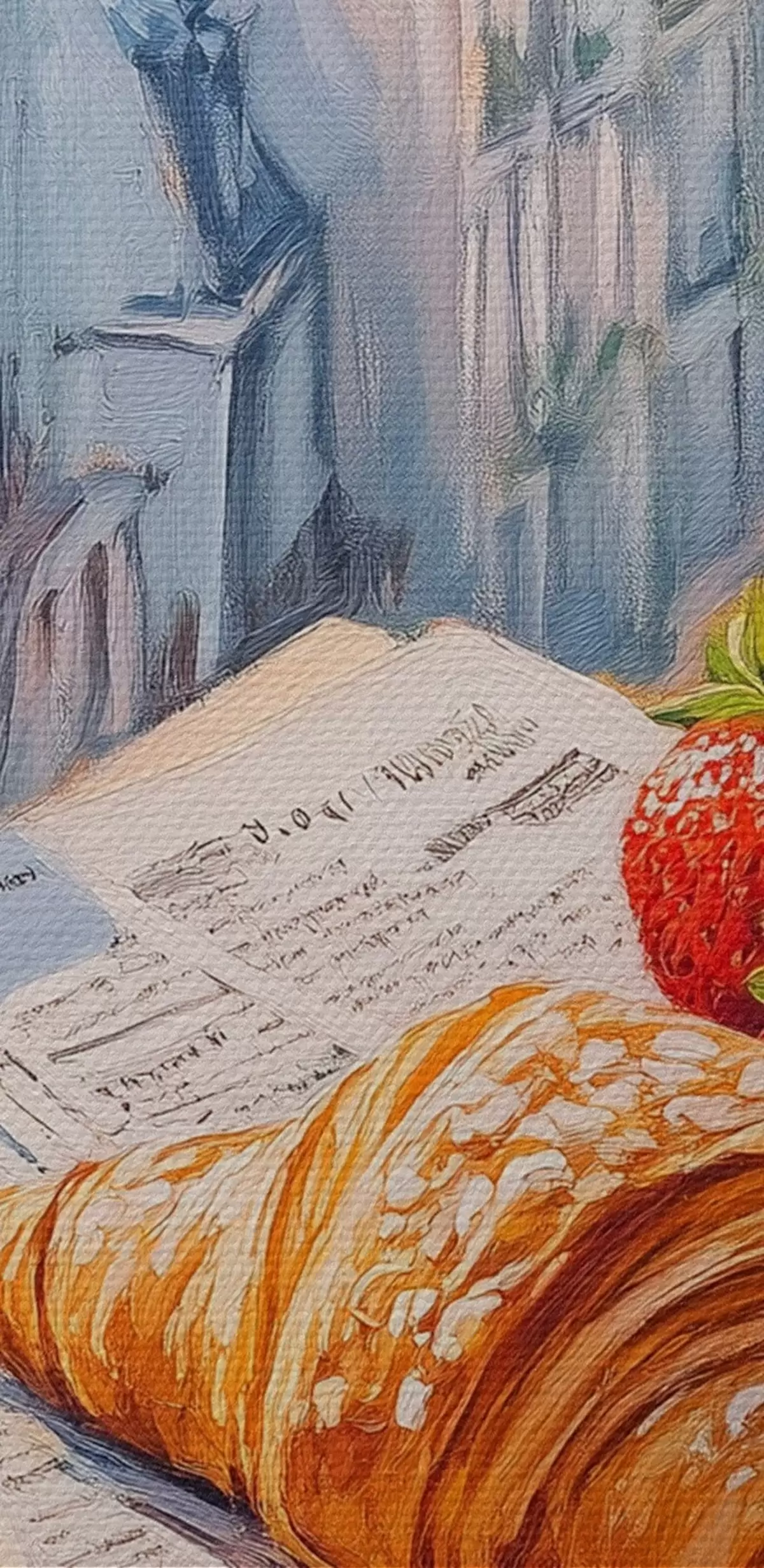 Okrągły obraz Wschód słońca na balkonie w Paryżu, wieża Eiffla, truskawki, kawa, dziennik Nr r43890