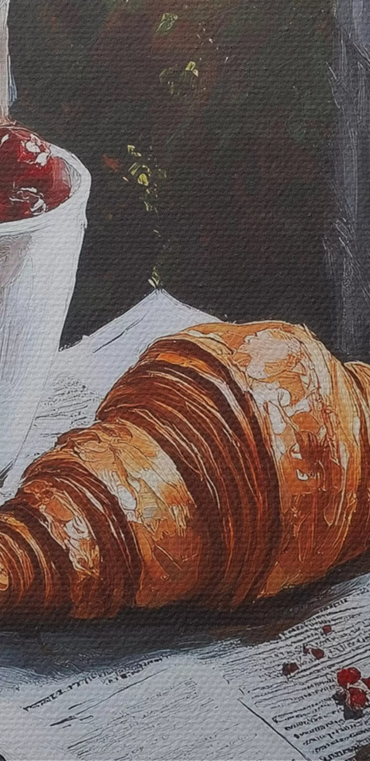 Okrągły obraz Paryski poranek, kawa z rogalikami, widok na miasto, rysunek olejny Nr r43892