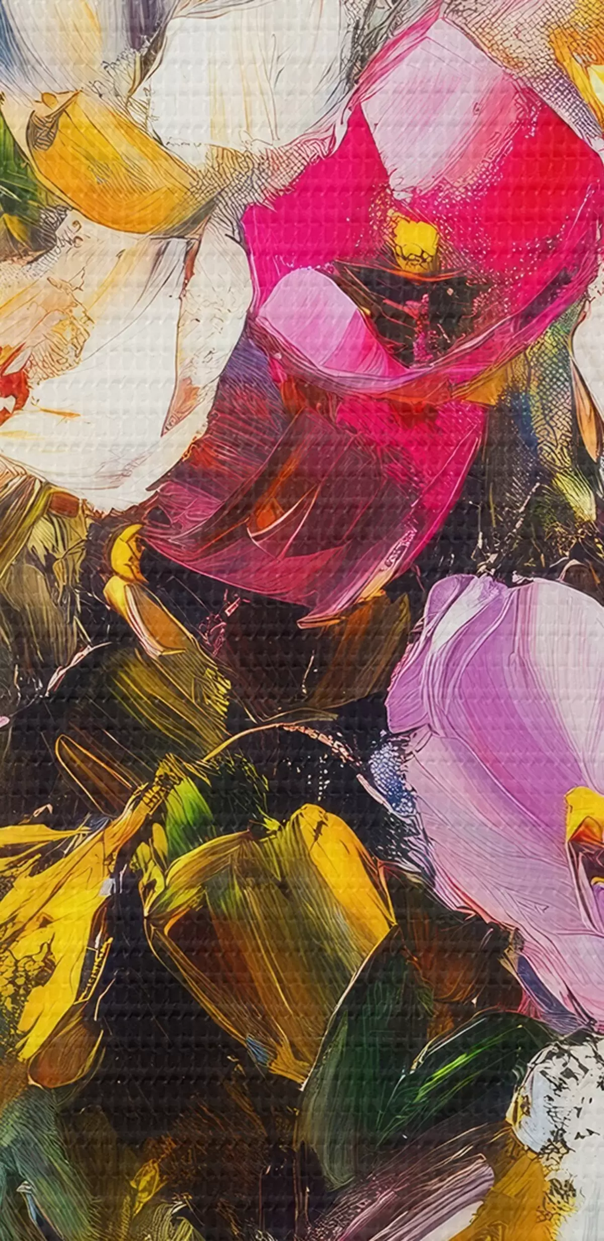 Do zamówienia dostępne są trzy rodzaje materiału: Economic Canvas - gęsty i trwały materiał do druku cyfrowego, identyczny z płótnem malarskim, wodoodporna powierzchnia, realistyczne odwzorowanie szczegółów, materiał średnioziarnisty. Premium Canvas - tekstura przypominająca płótno malarskie (przeplatane drobne nitki). Miękka, szczegółowa reprodukcja obrazu na matowej powierzchni. Eco-Premium - wysokiej jakości tkanina w 100% bawełniana. Dzięki naturalnym włóknom bawełnianym materiał jest trwały i odporny na zużycie. Doskonałe odwzorowanie kolorów i szczegółów.
