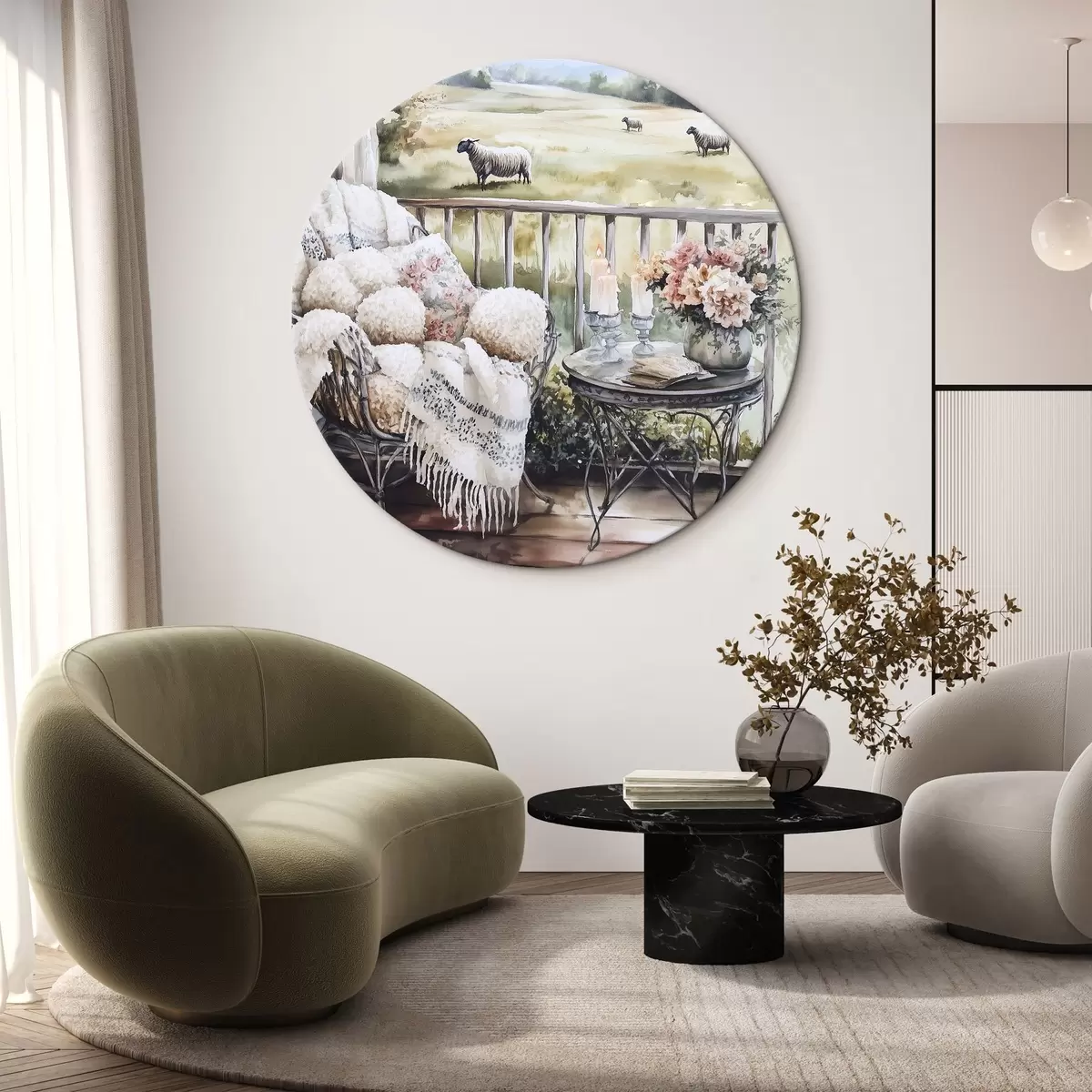Okrągły obraz Wiejskie gospodarstwo z owcami, polami, rustykalnymi kwiatami, styl akwareli Nr r44014