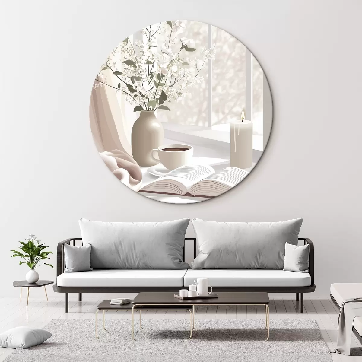 Okrągłe obrazy Wiosenny poranek z kawą i kwiatami, delikatne pastelowe kolory r44015