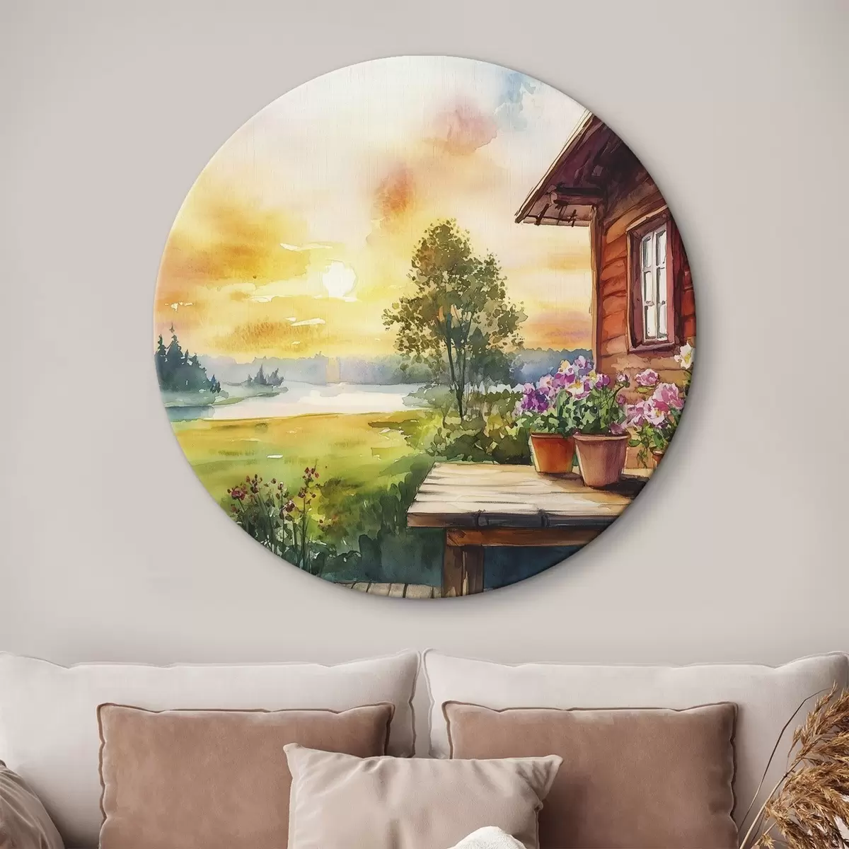 Okrągłe obrazy Kolory zachodu słońca, dom wiejski, styl akwarelowy, rustykalny, letnie kwiaty r44017