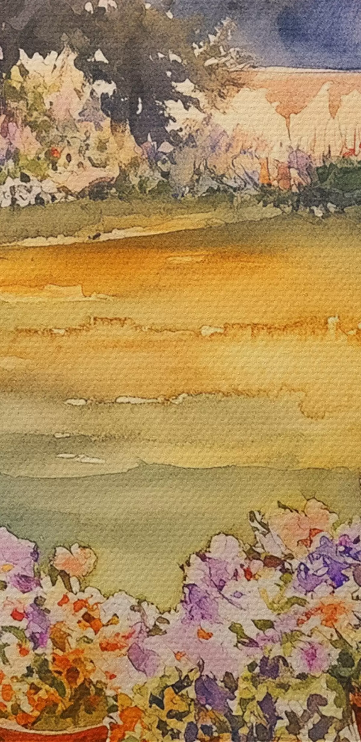 Okrągły obraz Kwiaty w wiejskim ogrodzie, kolory zachodu słońca, styl akwareli Nr r44019