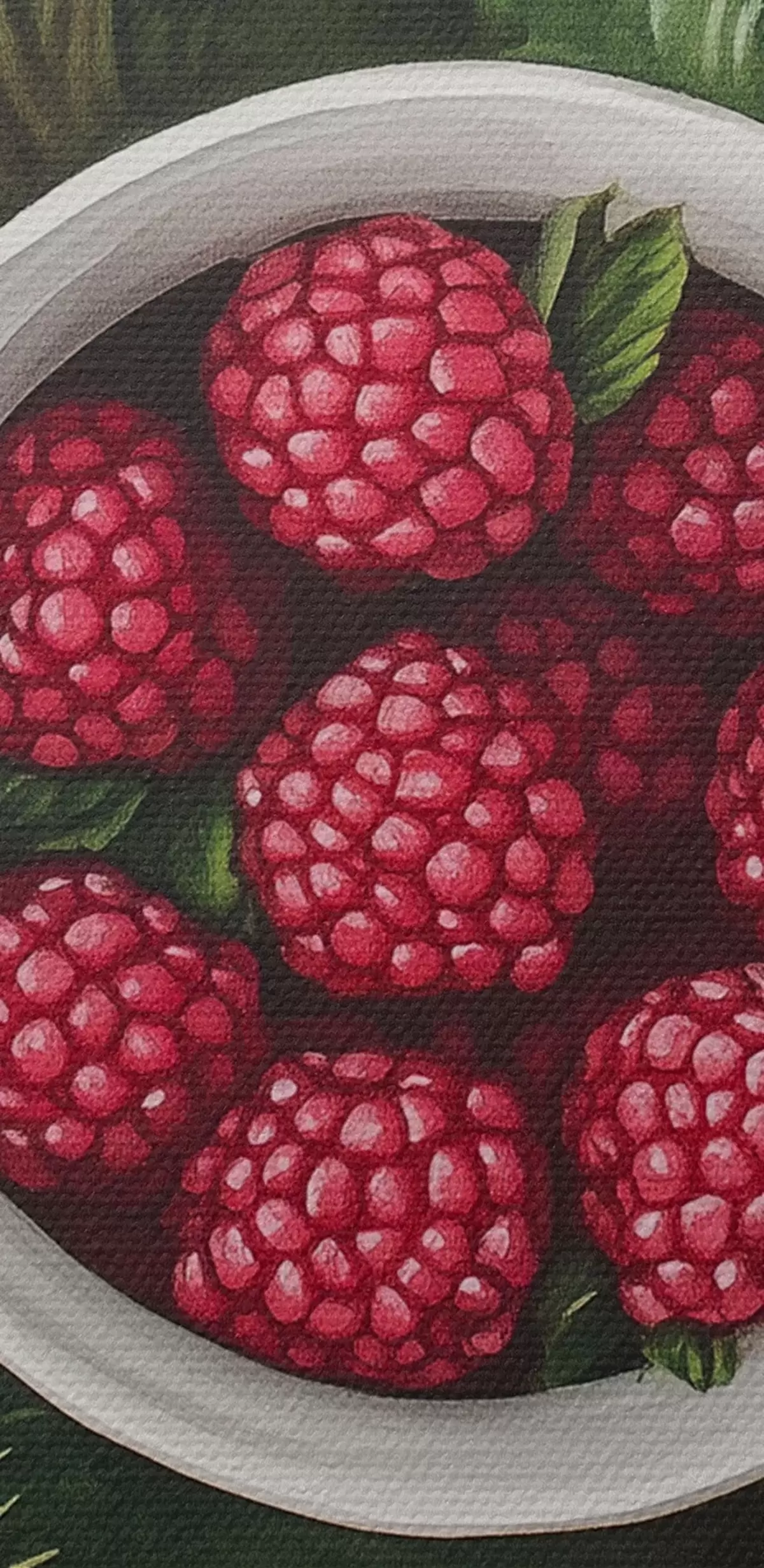 Okrągły obraz Filiżanka malin w zielonym lesie, natura, styl akwareli Nr r44021