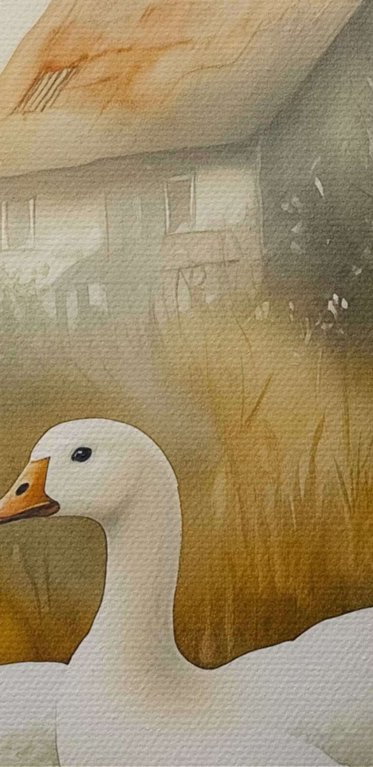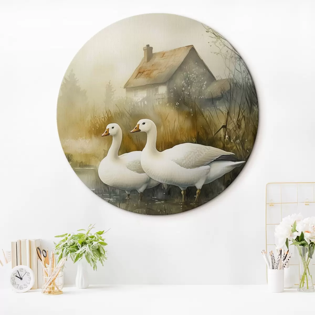 Okrągłe obrazy Gęsi w jeziorze w pobliżu gospodarstwa, rustykalny styl akwareli r44022