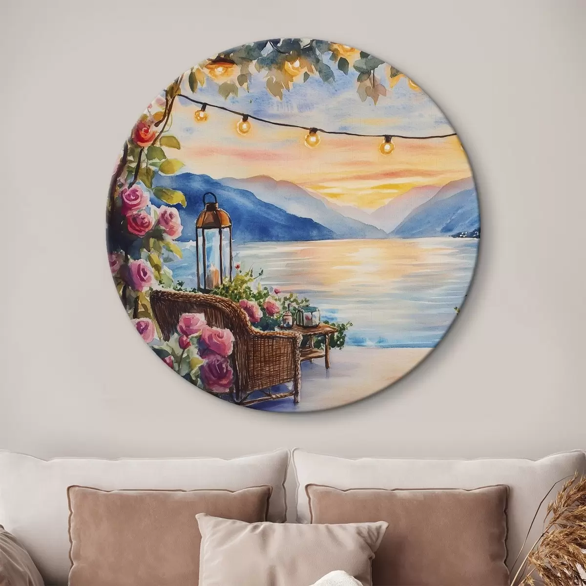 Okrągłe obrazy Piękny zachód słońca w górach, jezioro, róże, styl boho r44025
