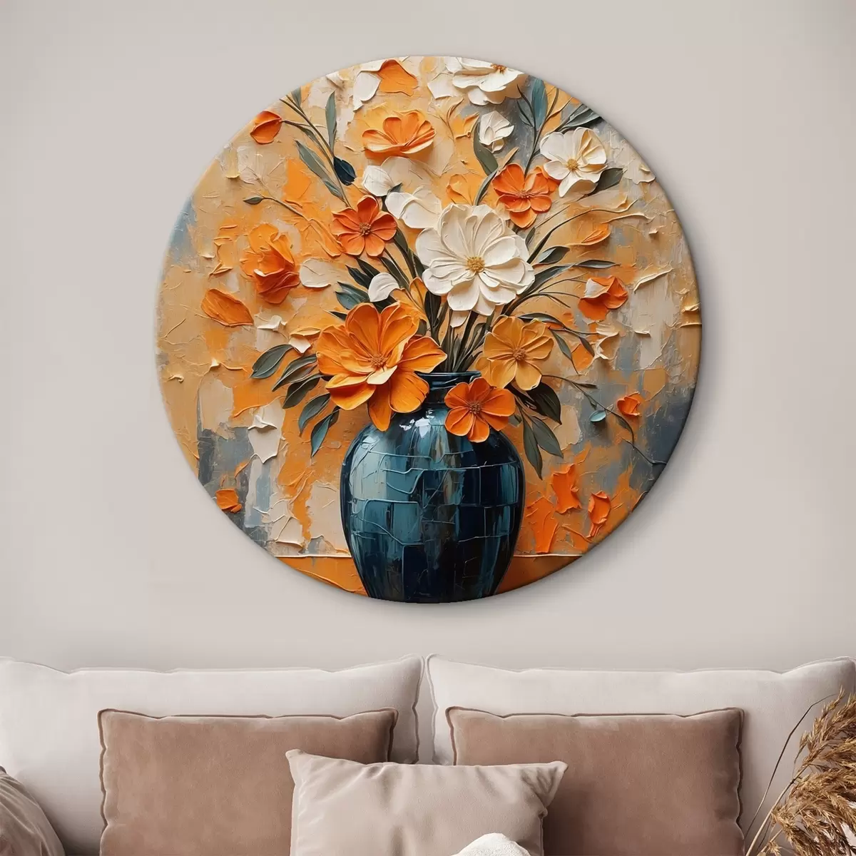 Okrągłe obrazy Białe i pomarańczowe kwiaty w wazonie w stylu malarstwa olejnego r44059