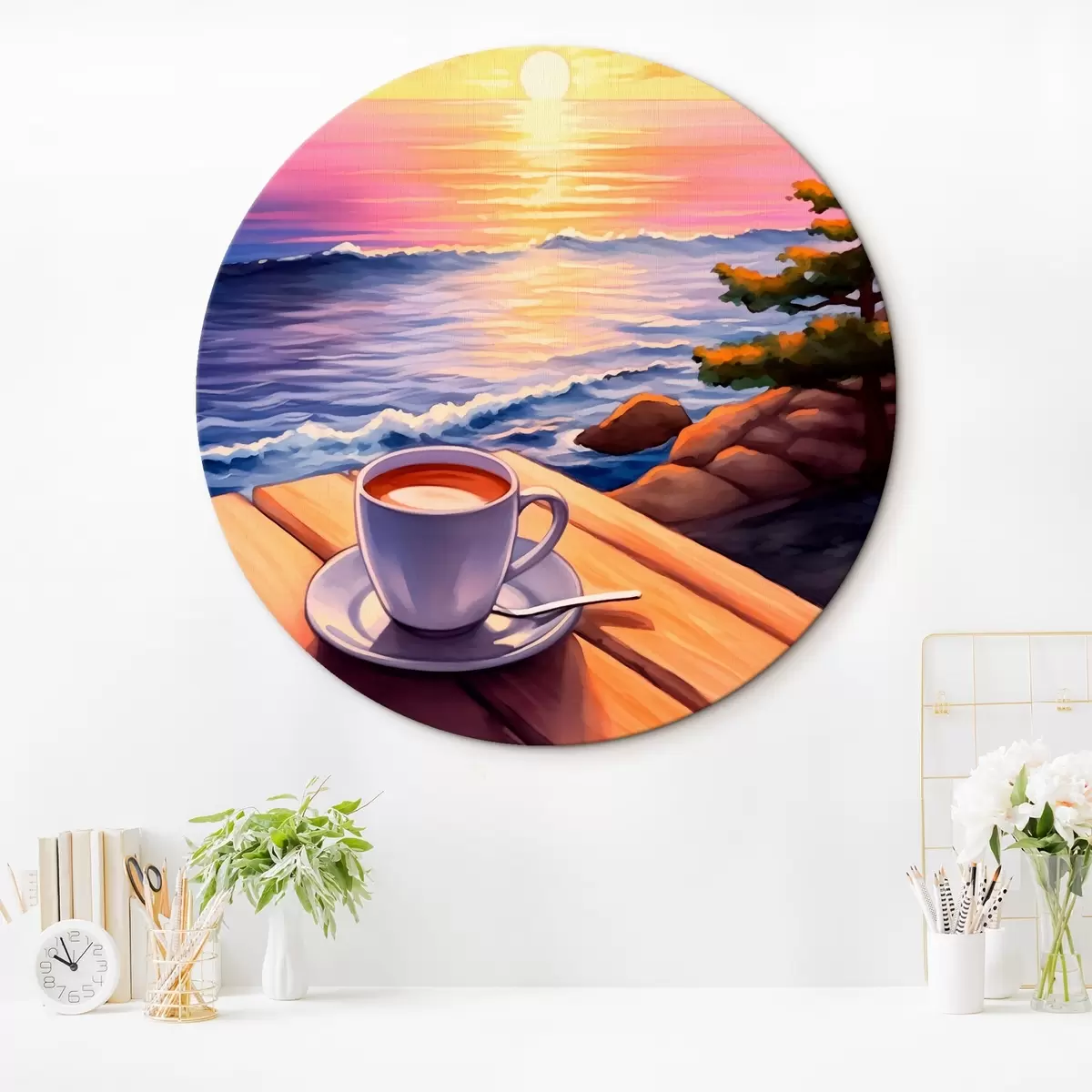 Okrągły obraz Filiżanka kawy na tle krajobrazu Nr r44105