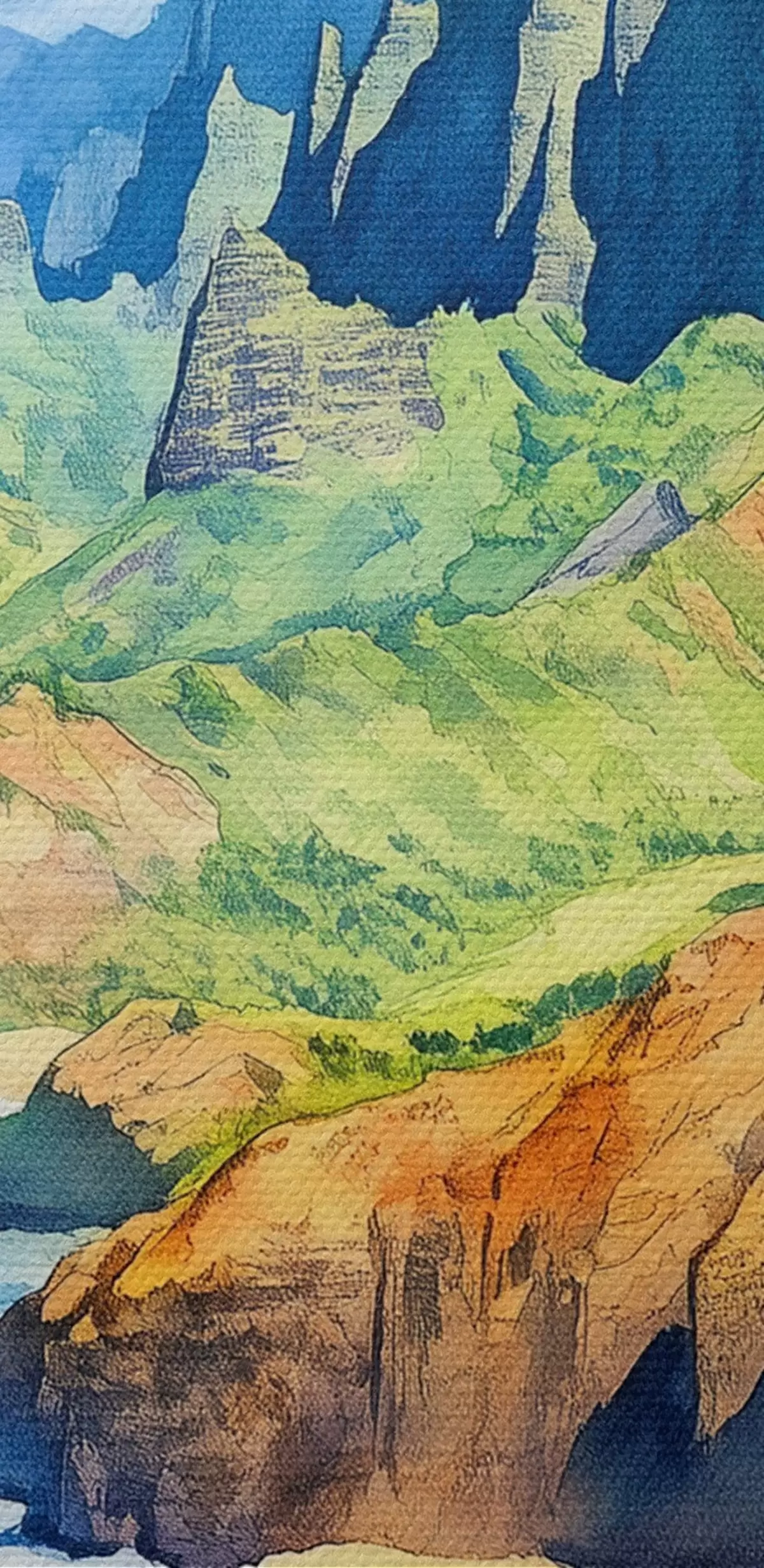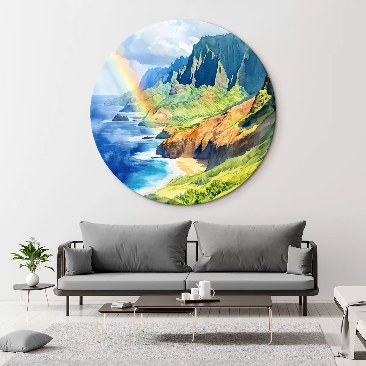 Okrągłe obrazy Hawaje, akwarela, tęcza, zielone góry, ocean r44141