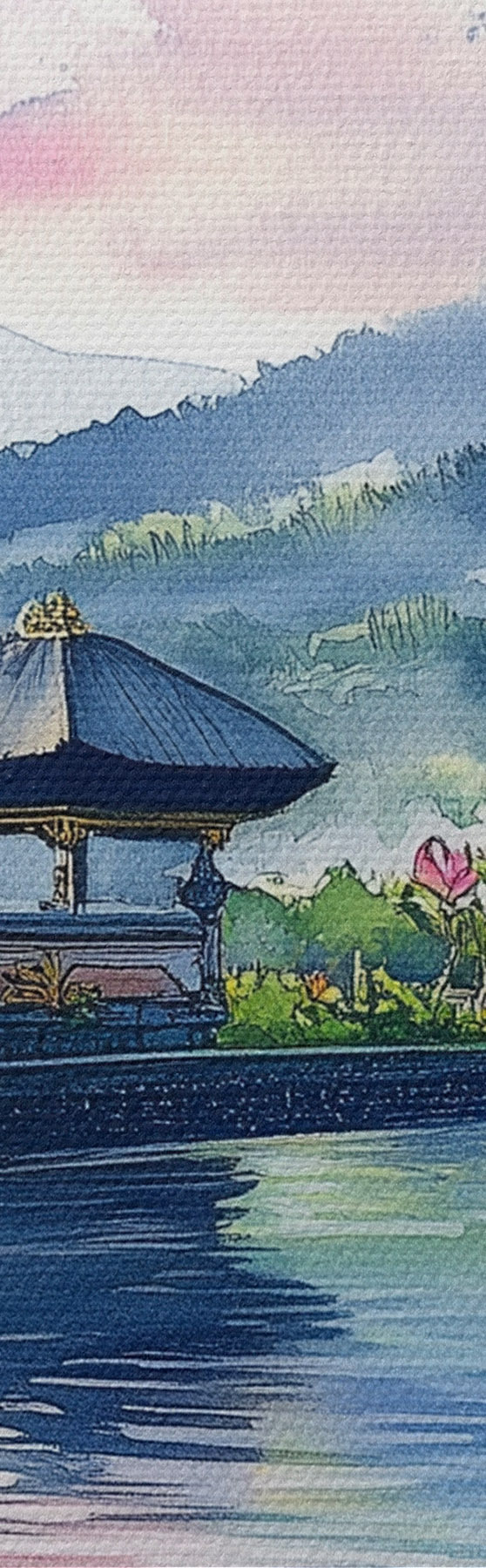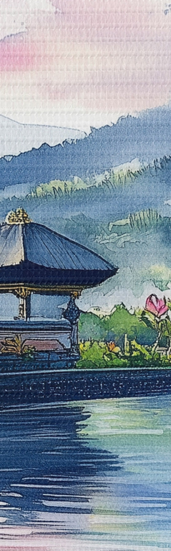Okrągły obraz Indonezyjska wyspa, świątynia, buddyzm, tropikalna przyroda, styl akwareli Nr r44148