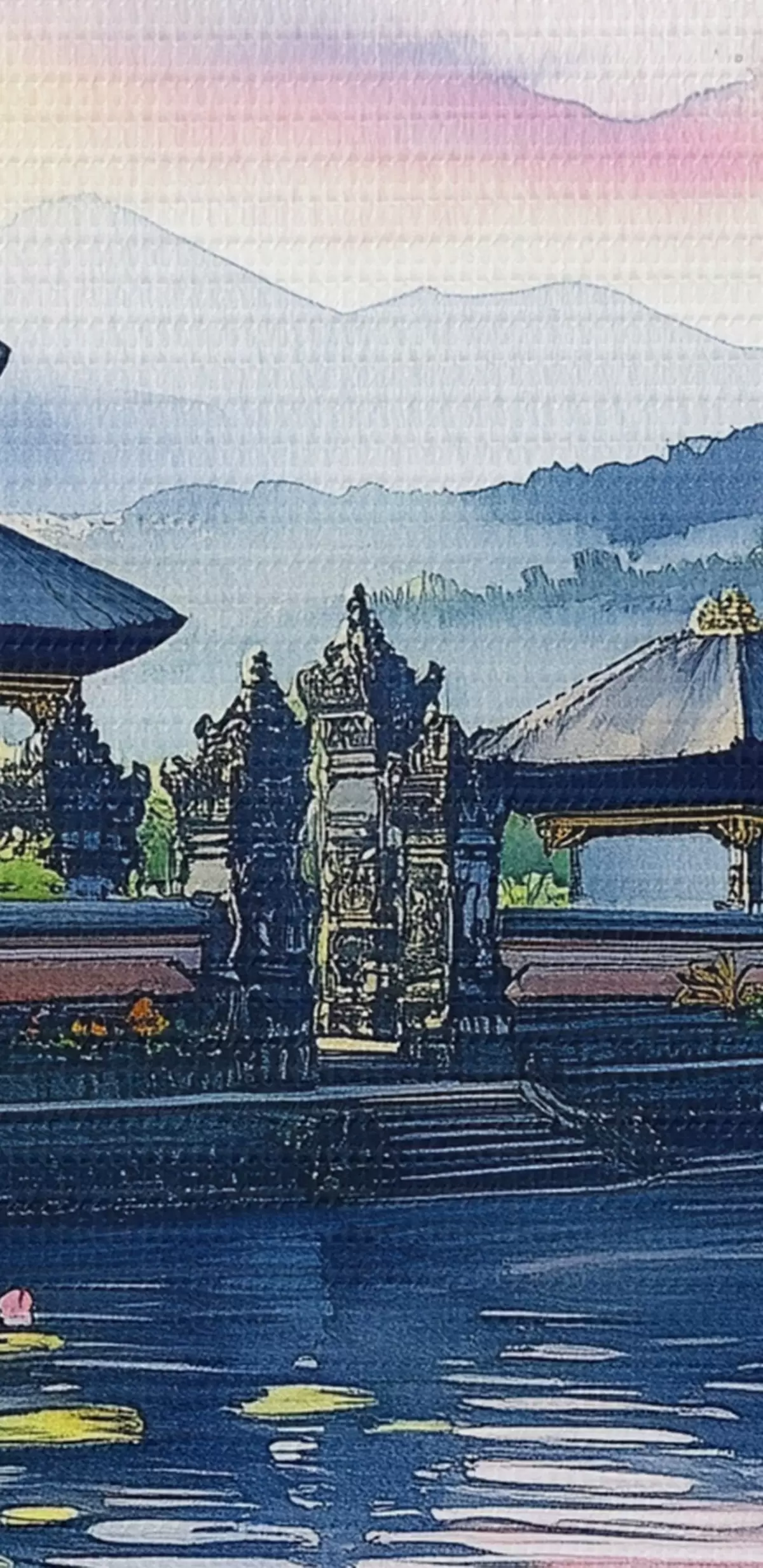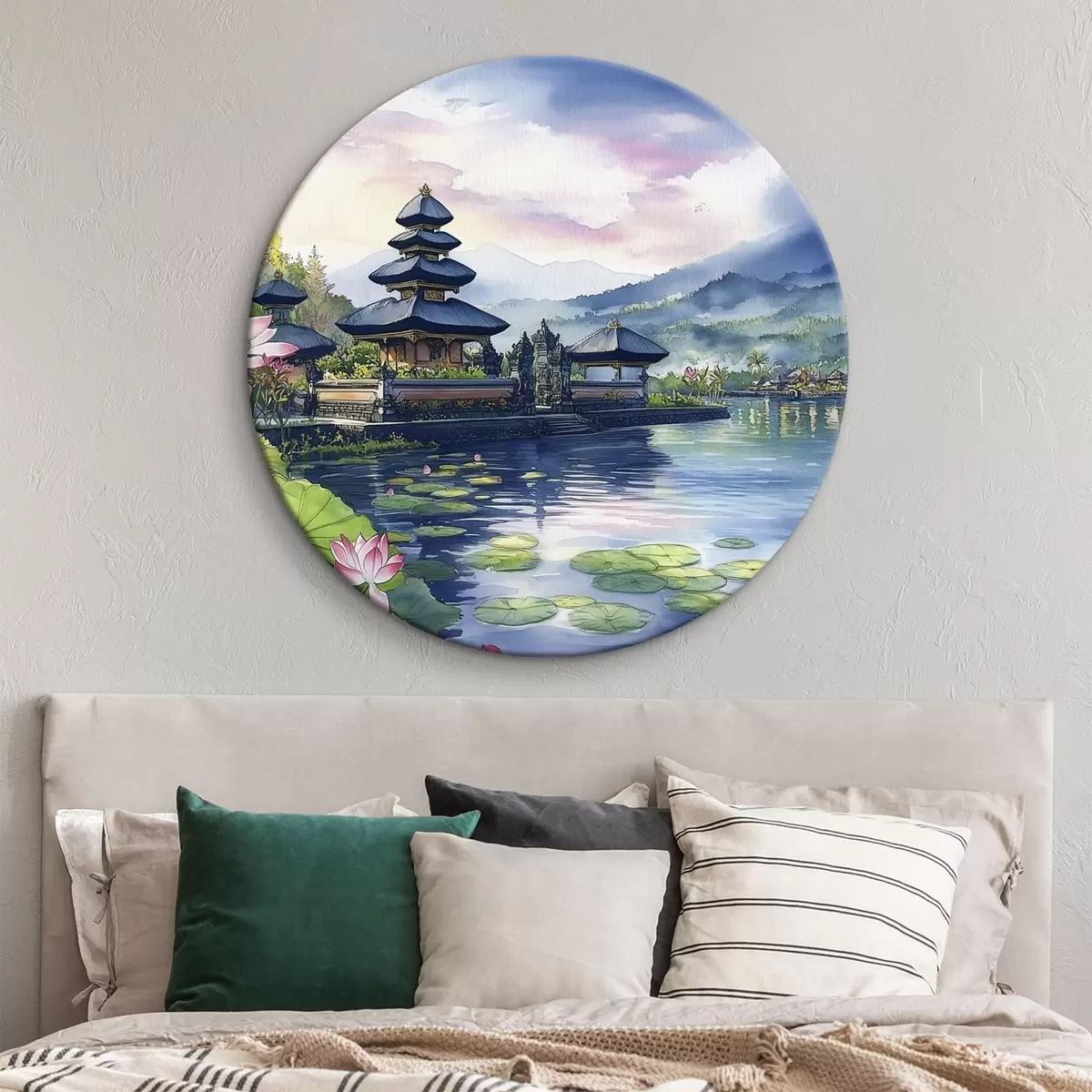 Okrągły obraz Indonezyjska wyspa, świątynia, buddyzm, tropikalna przyroda, styl akwareli Nr r44148