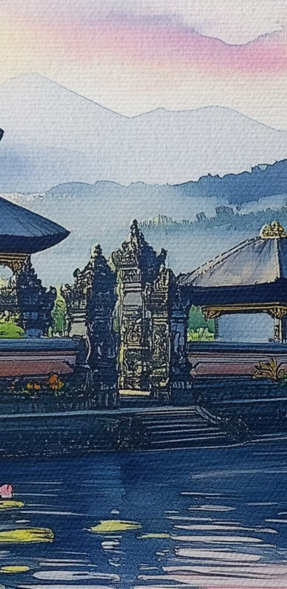 Okrągłe obrazy Indonezyjska wyspa, świątynia, buddyzm, tropikalna przyroda, styl akwareli r44148