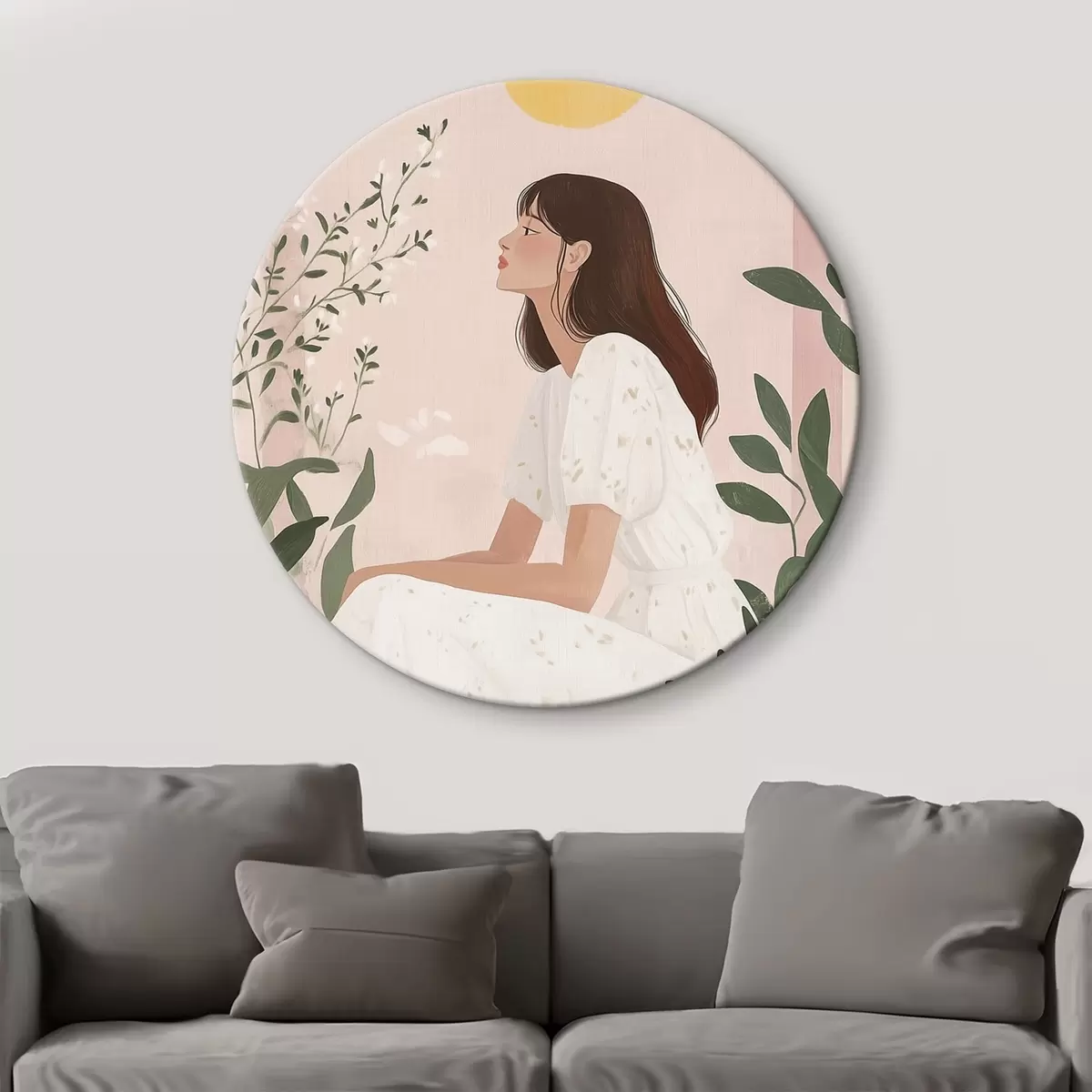Okrągły obraz Piękna kobieta w tropikalnym ogrodzie, słońce, pastelowe kolory Nr r44155