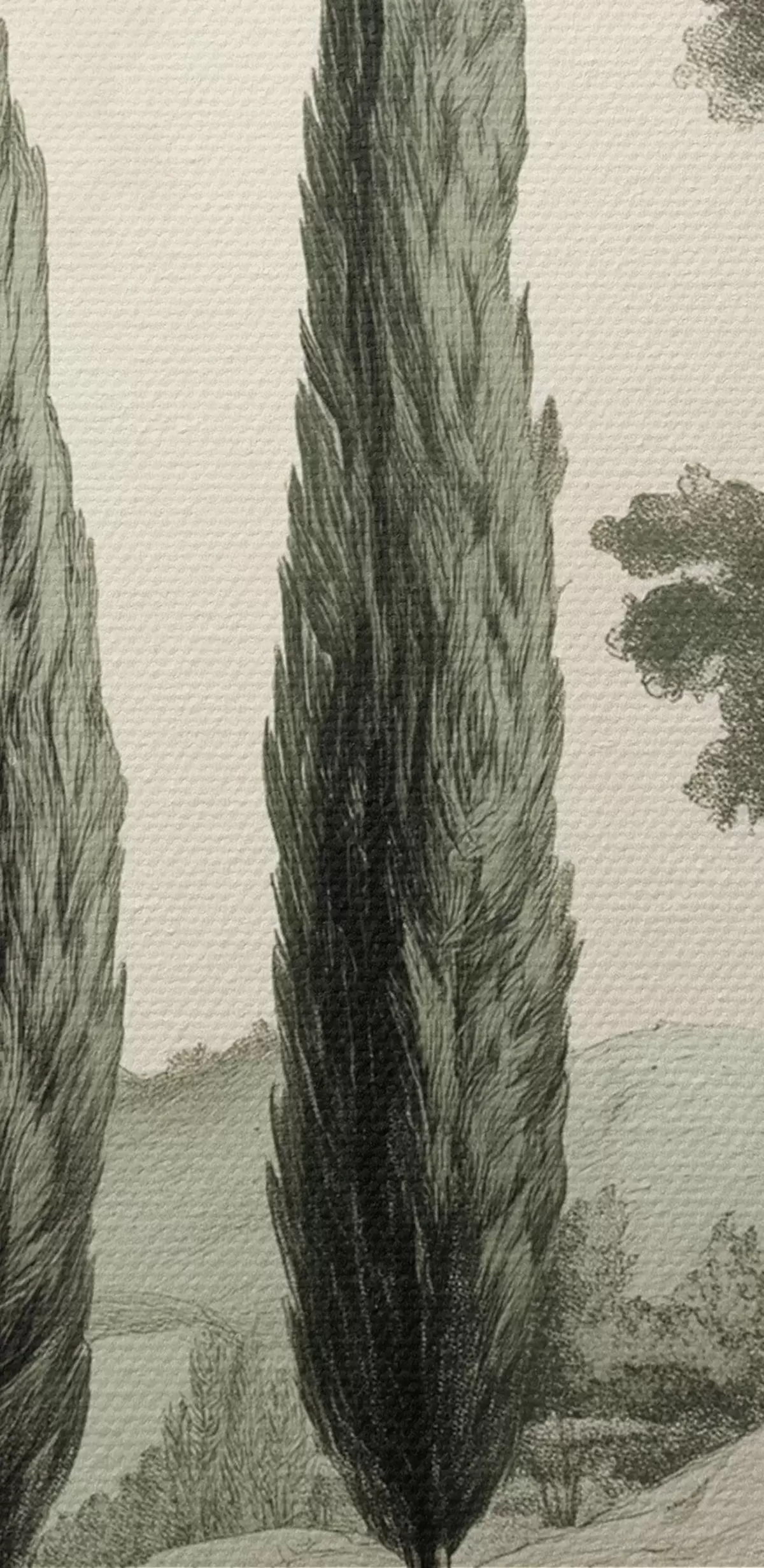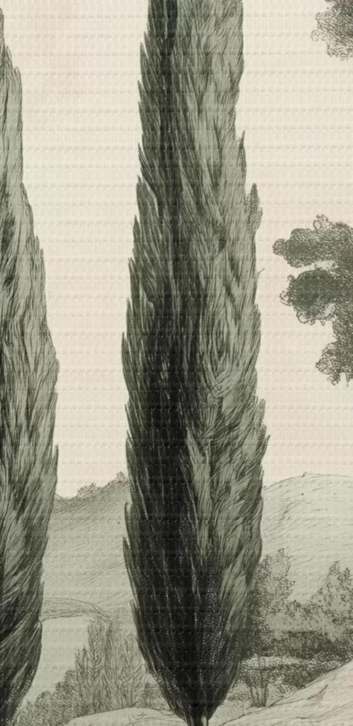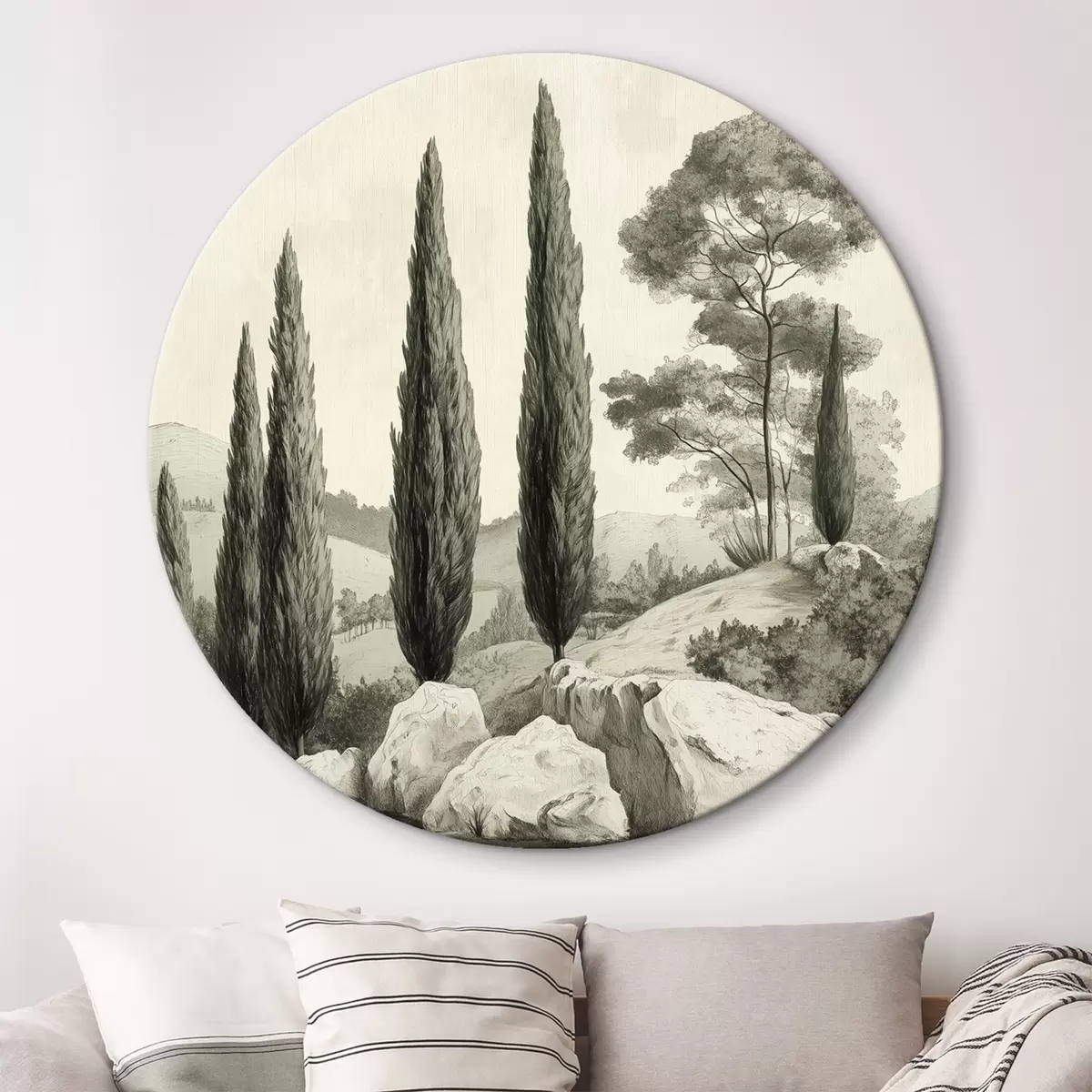 Okrągłe obrazy Toskańskie krajobrazy, pastelowe kolory, cyprysy, skały, styl rustykalny r44307