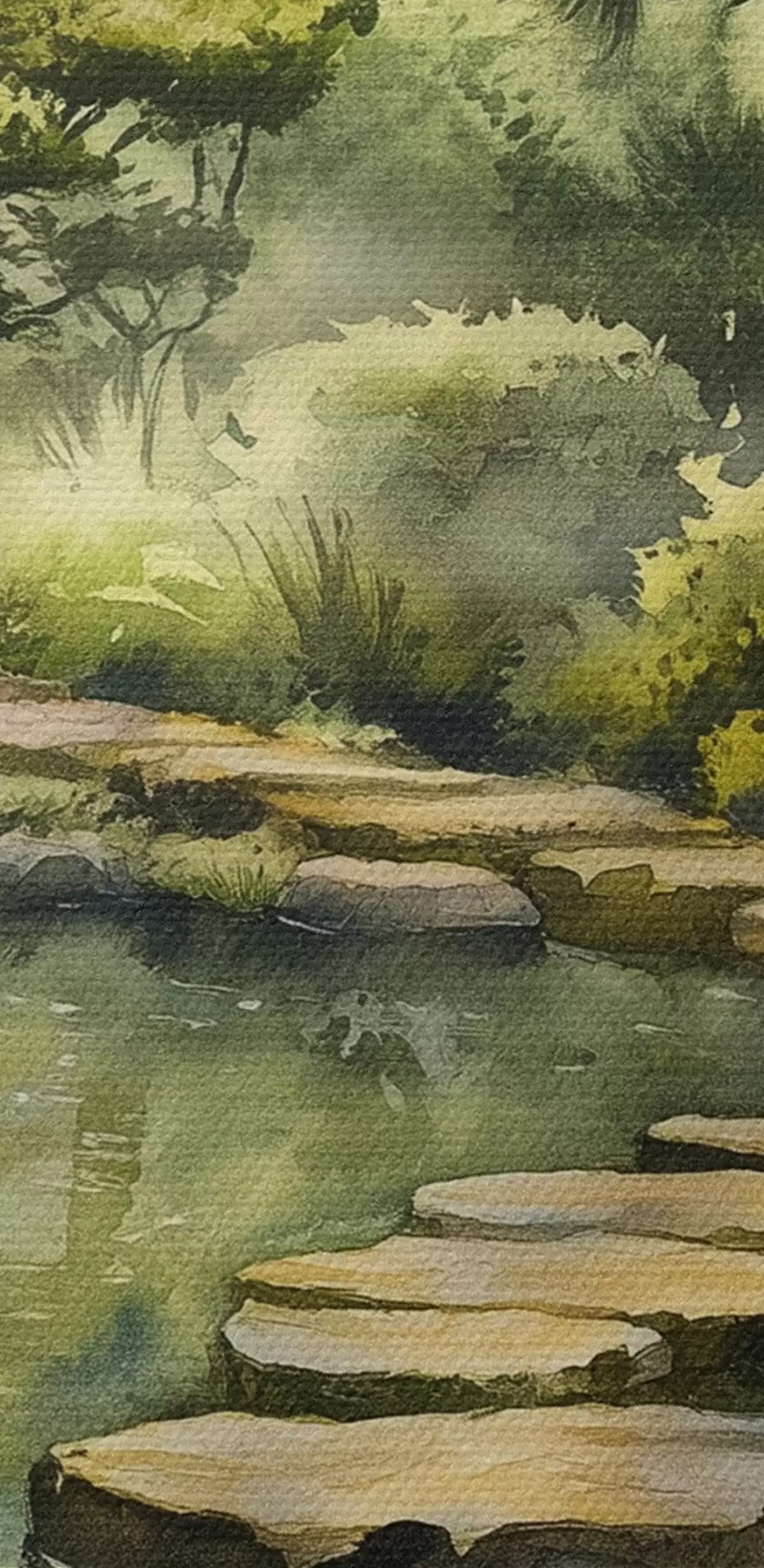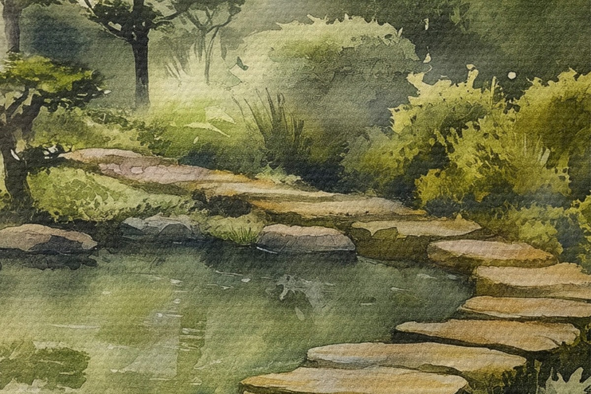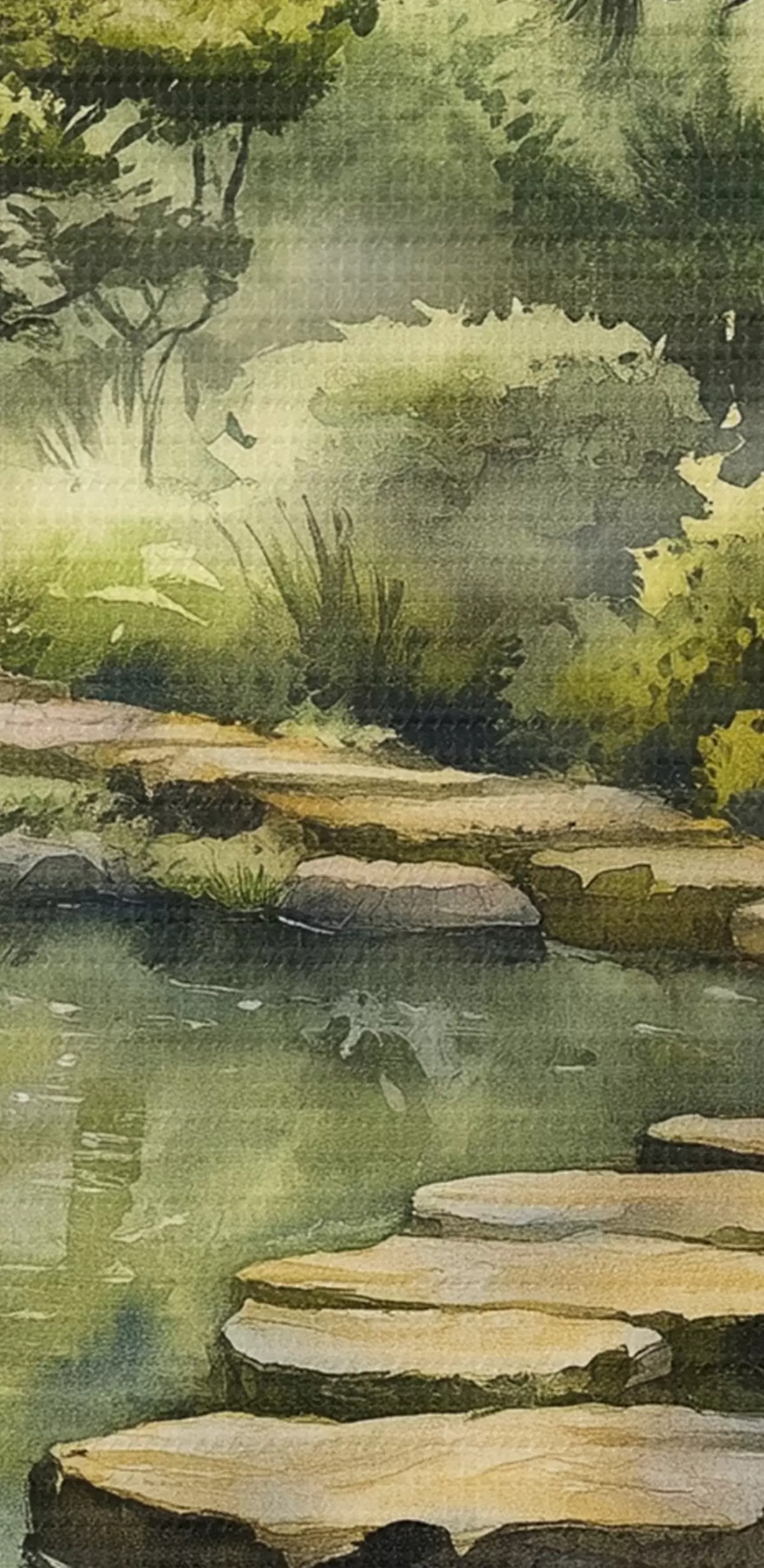 Okrągłe obrazy Orientalny las ze skałami, stawem i sosnami, zieleń, styl akwareli r44311