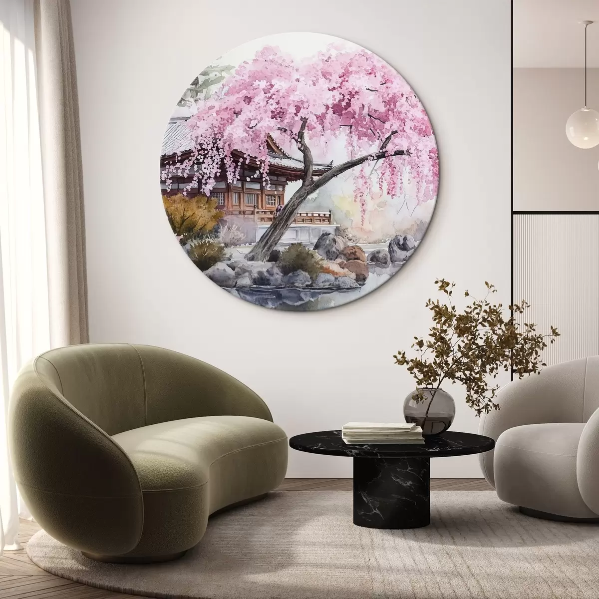 Okrągły obraz Różowe drzewo cherry w pobliżu domu nad jeziorem, Japonia, orientalny, styl akwareli Nr r44312