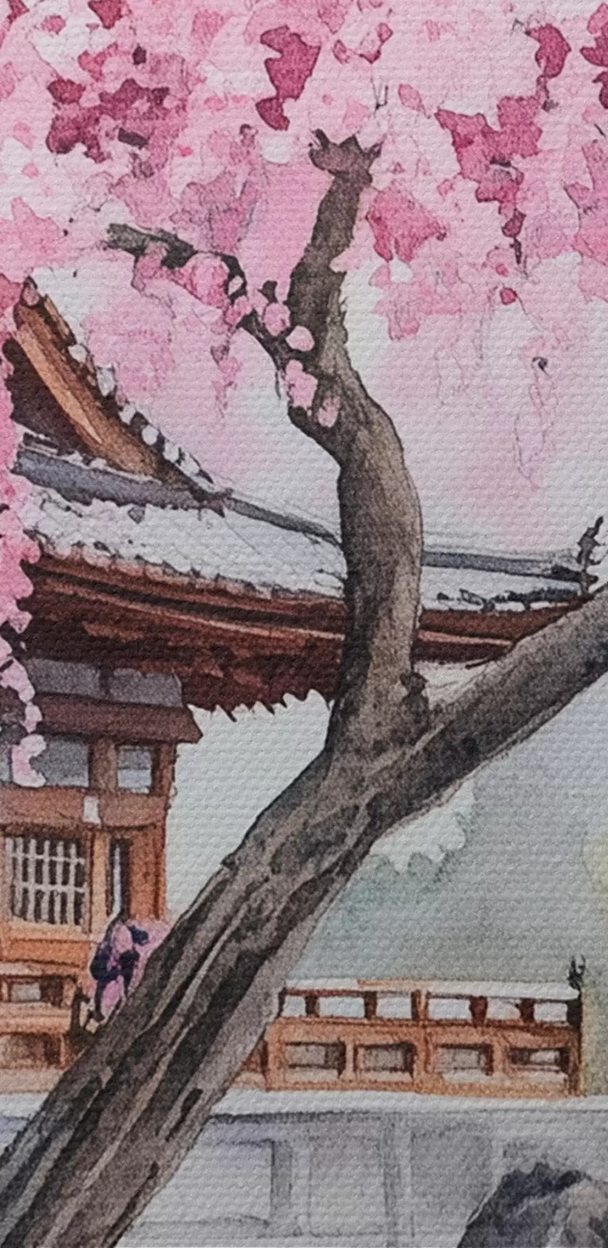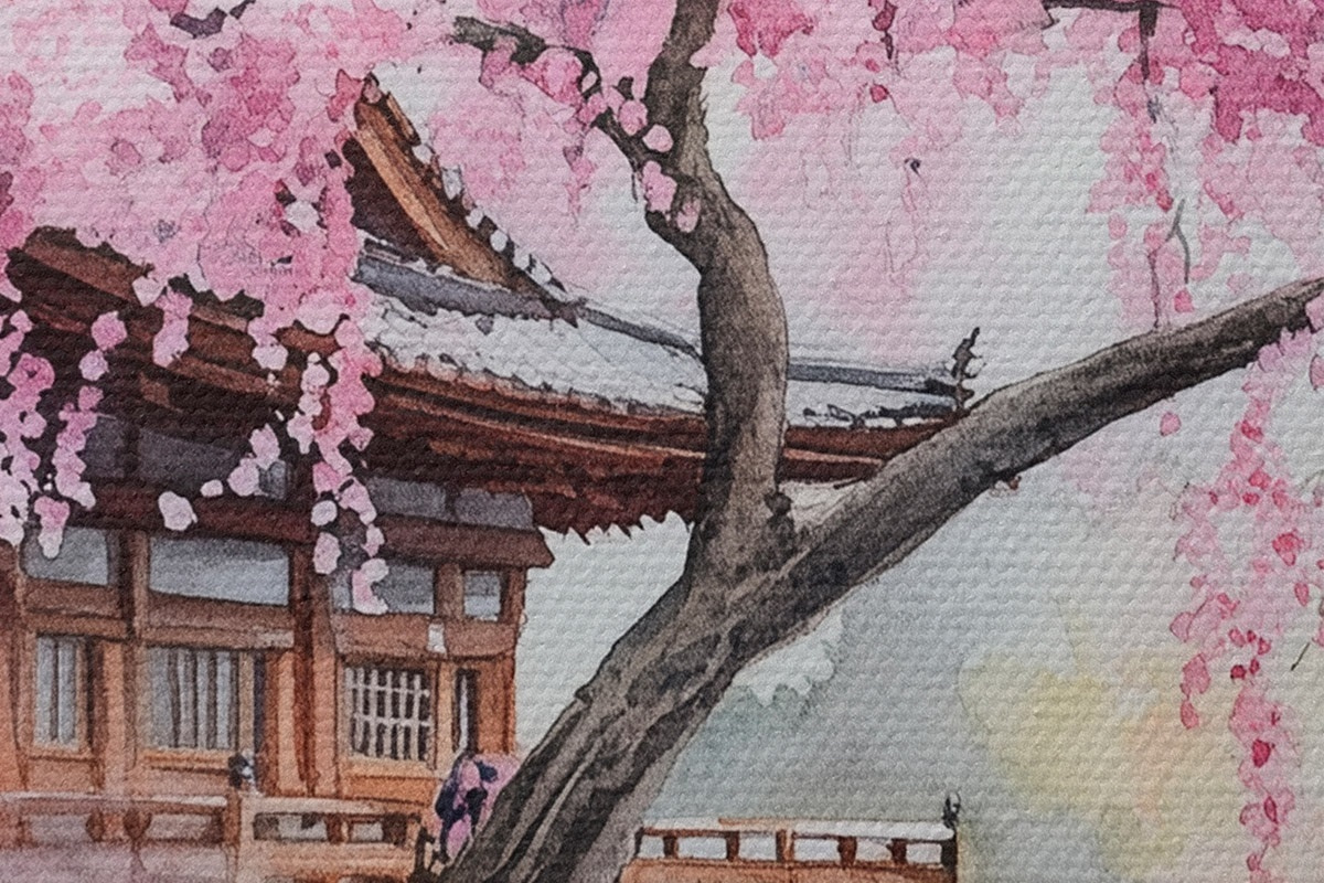 Okrągłe obrazy Różowe drzewo cherry w pobliżu domu nad jeziorem, Japonia, orientalny, styl akwareli r44312