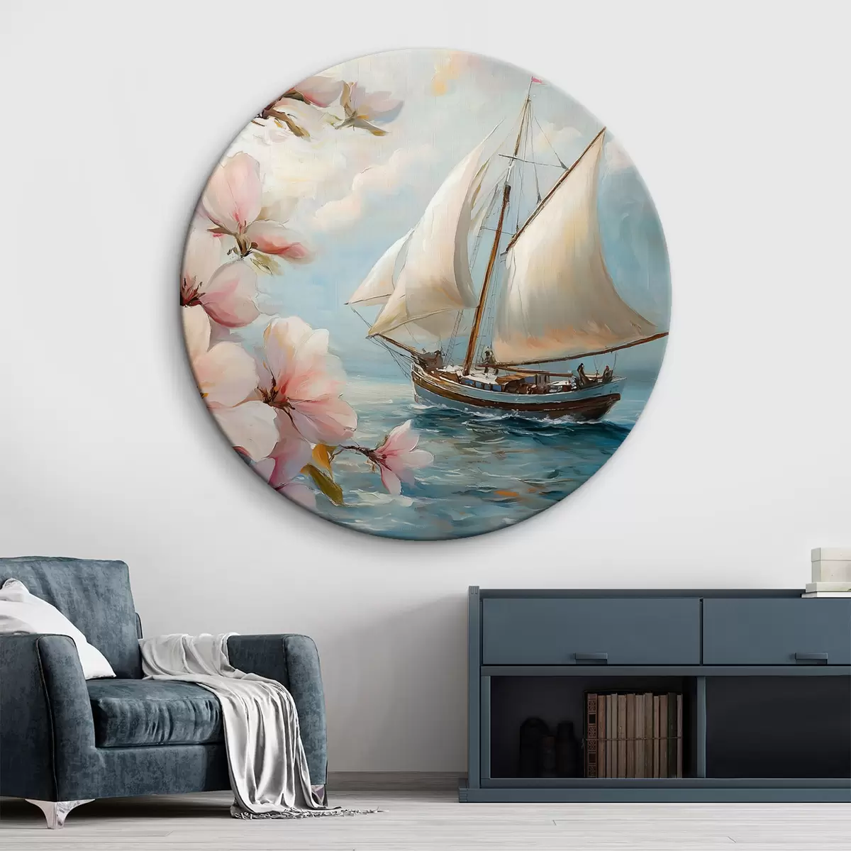 Okrągły obraz Łódź na morzu i duże kwiaty Nr r44330