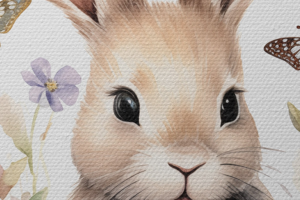 Okrągły obraz Uroczy króliczek w stylu akwareli w kwiatach z motylami Nr r44388