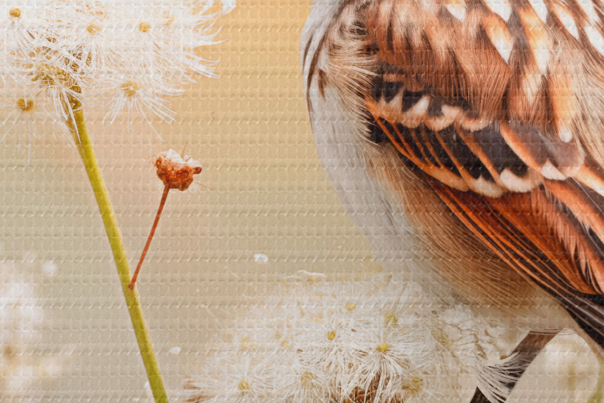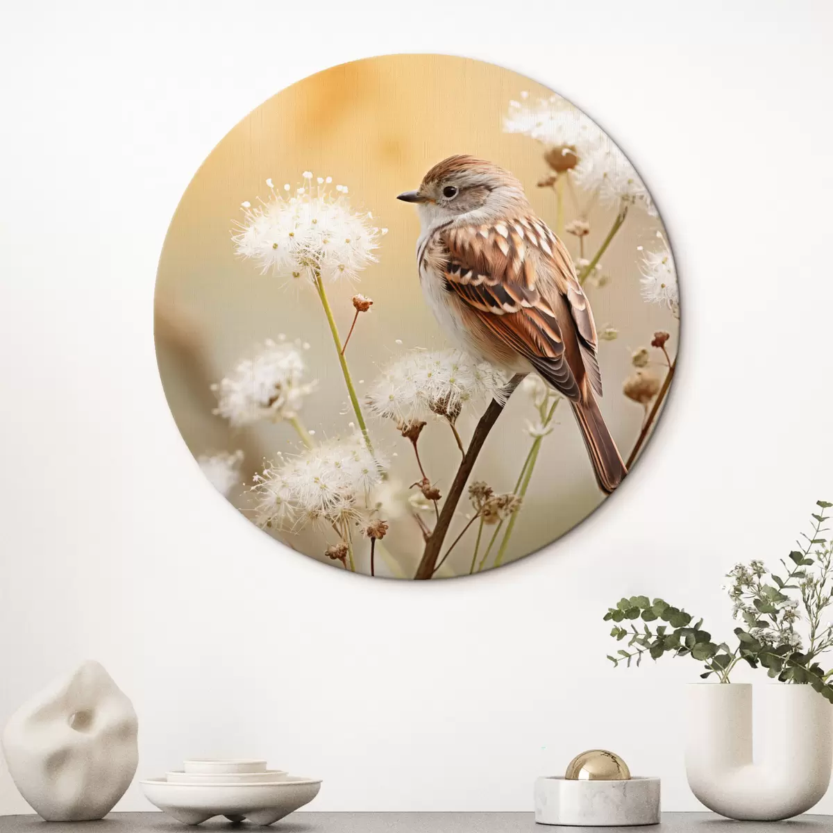 Okrągły obraz Ptak siedzący na gałęzi z białymi kwiatami, miękka ostrość, tło natury Nr r44393