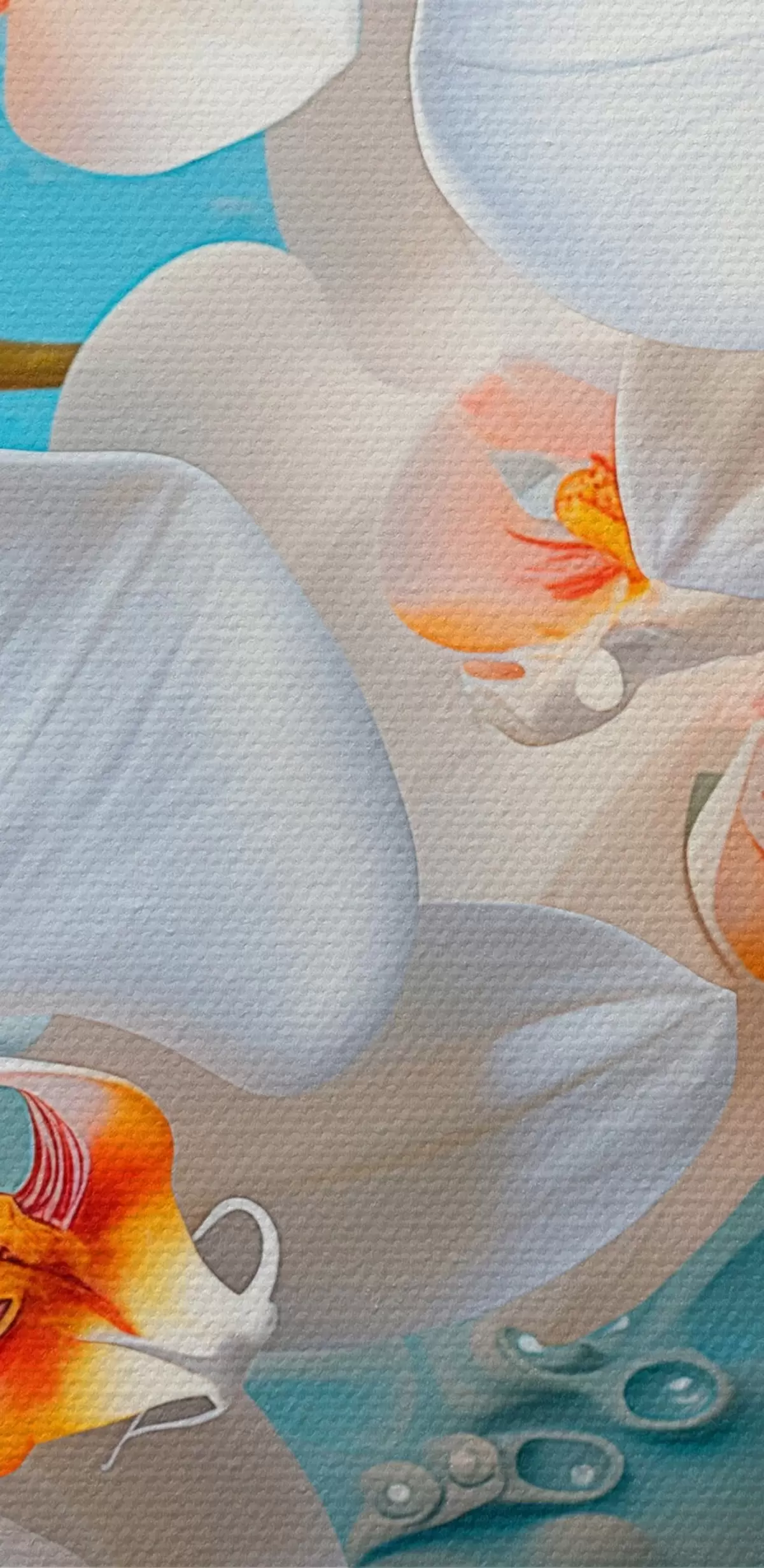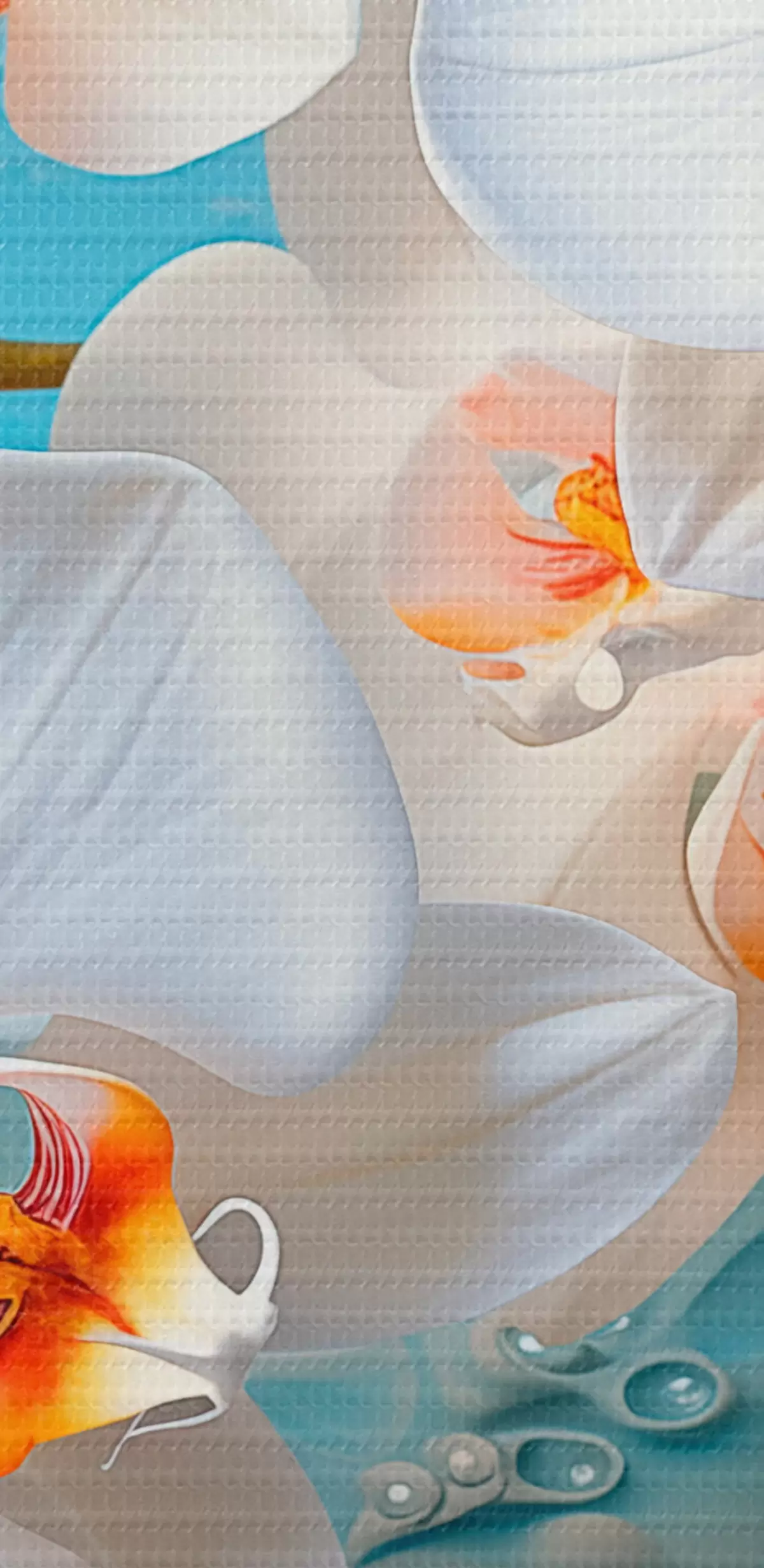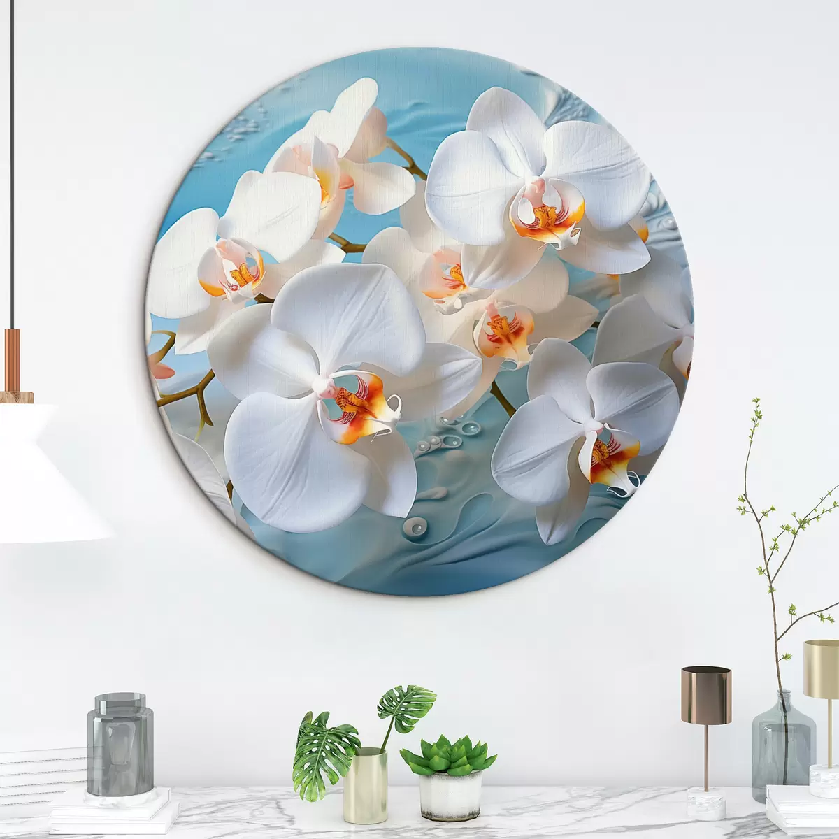 Okrągły obraz Białe orchidee, ułożone na jasnoniebieskiej powierzchni z kroplami wody, miękkie oświetlenie Nr r44401