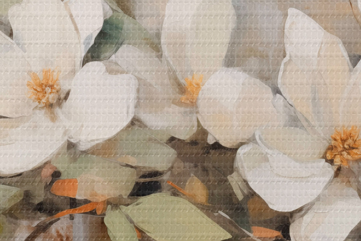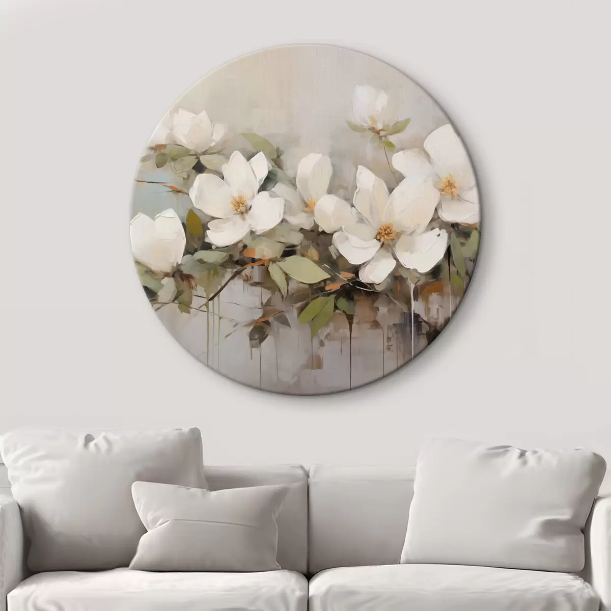 Okrągłe obrazy Białe kwiaty magnolii z zielonymi liśćmi na gałęzi, miękkie pociągnięcia pędzla, stonowane kolory r44404