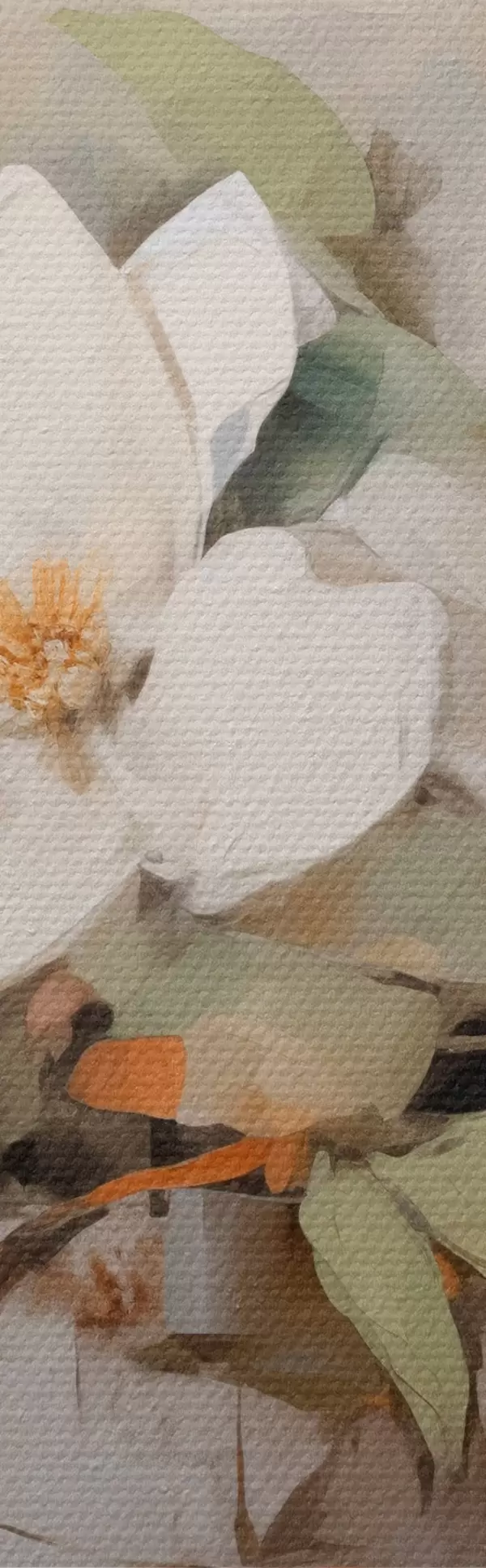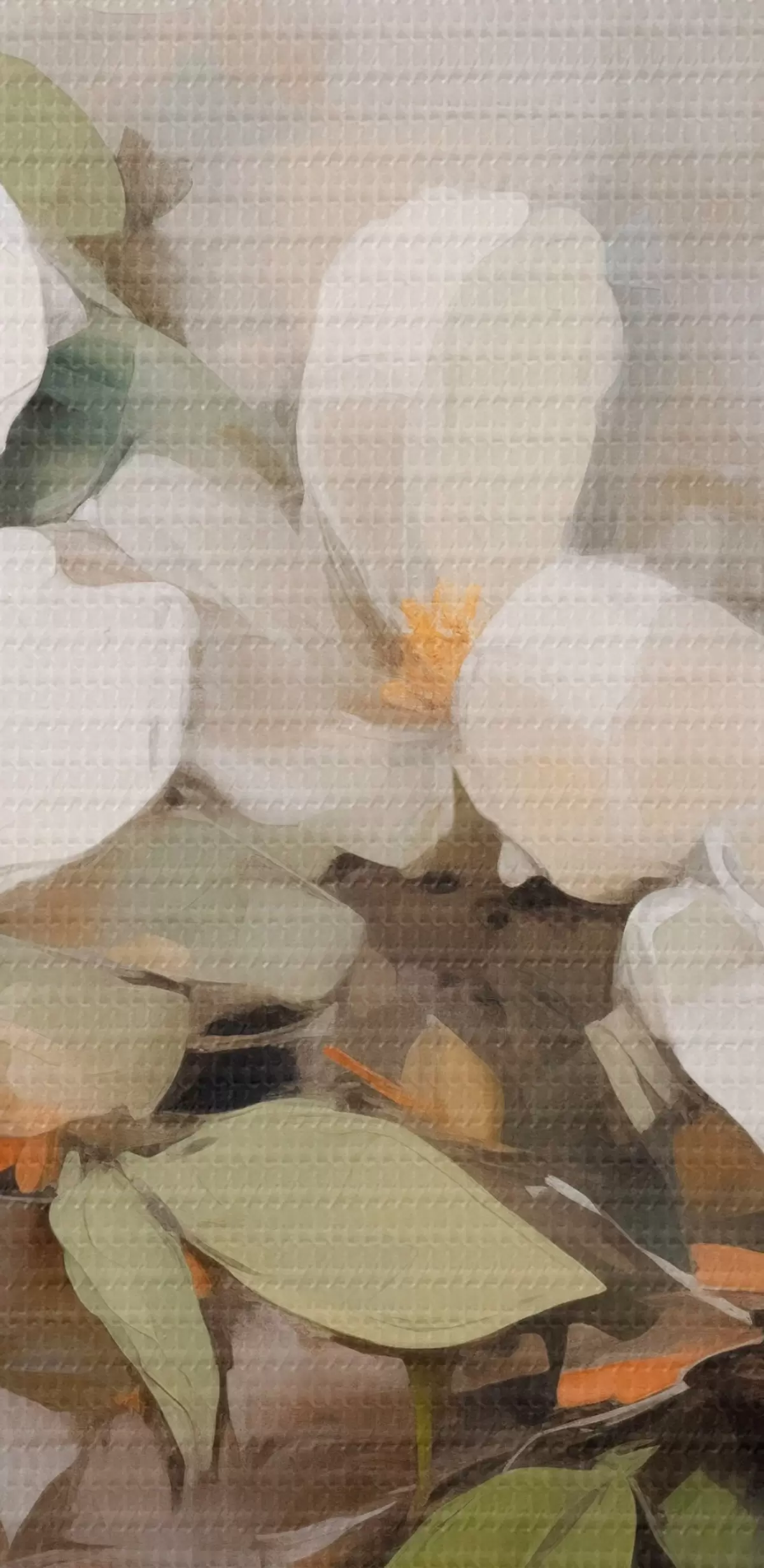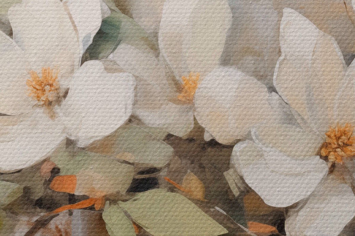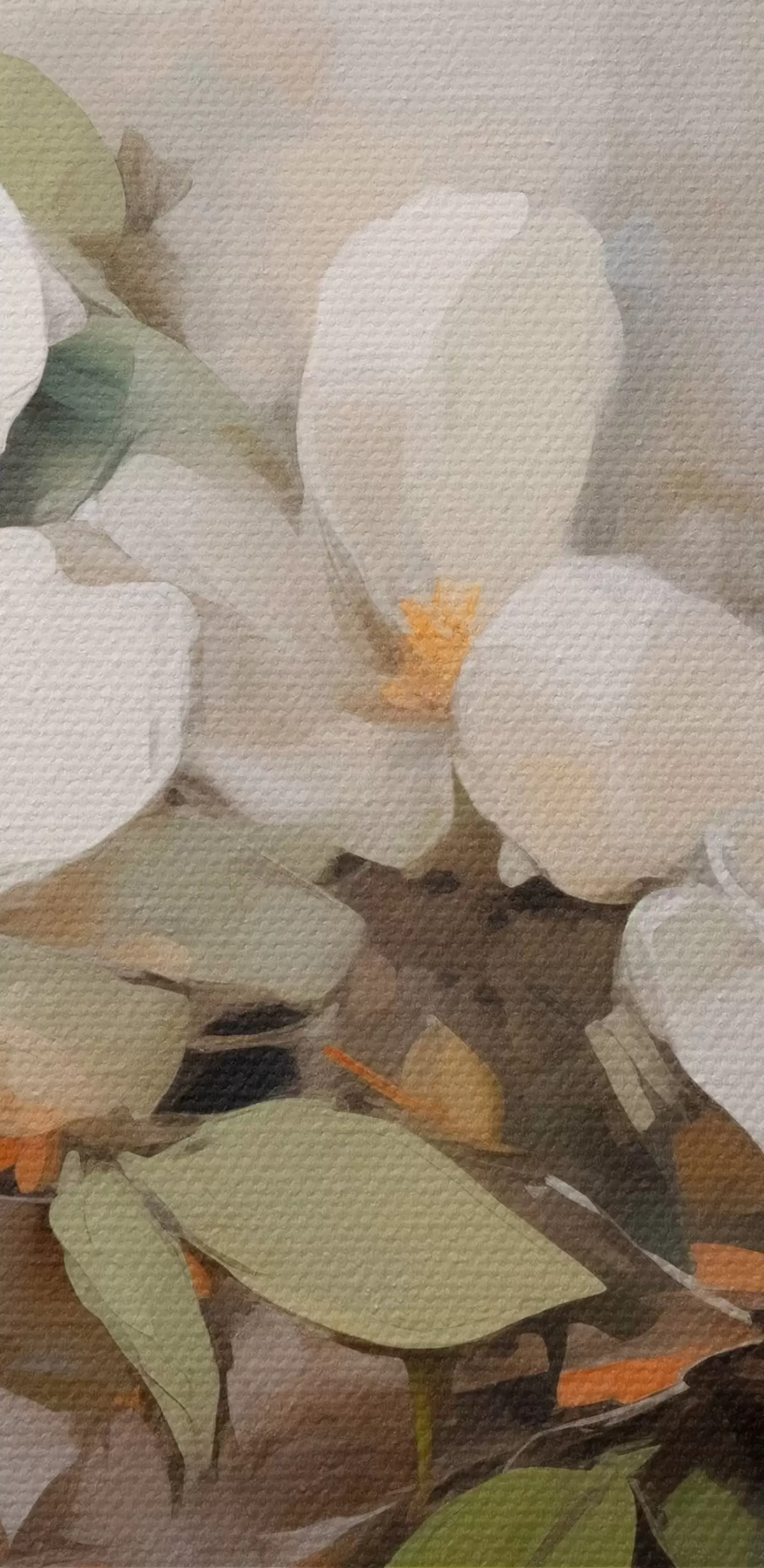 Okrągły obraz Białe kwiaty magnolii z zielonymi liśćmi na gałęzi, miękkie pociągnięcia pędzla, stonowane kolory Nr r44404