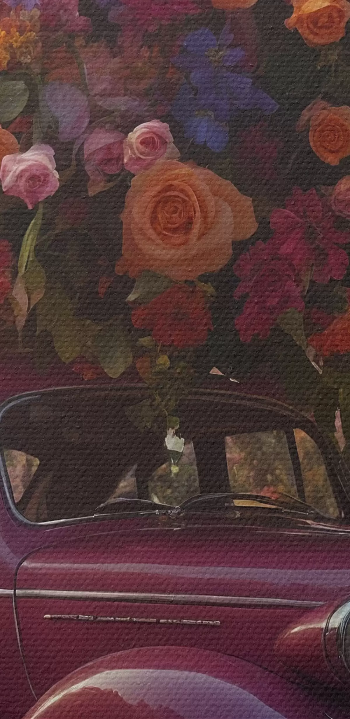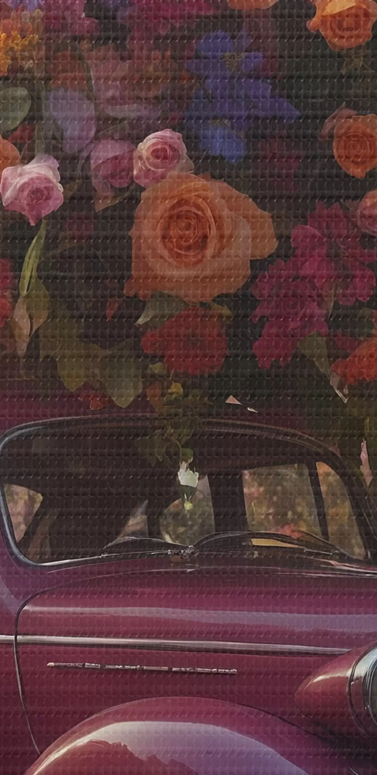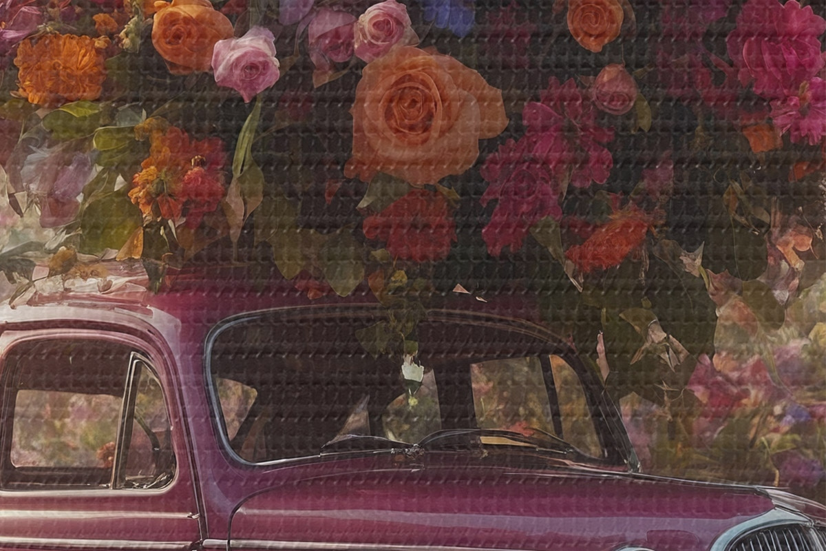 Okrągłe obrazy Samochód retro i ogromny bukiet kwiatów r44471