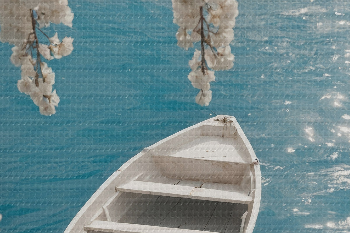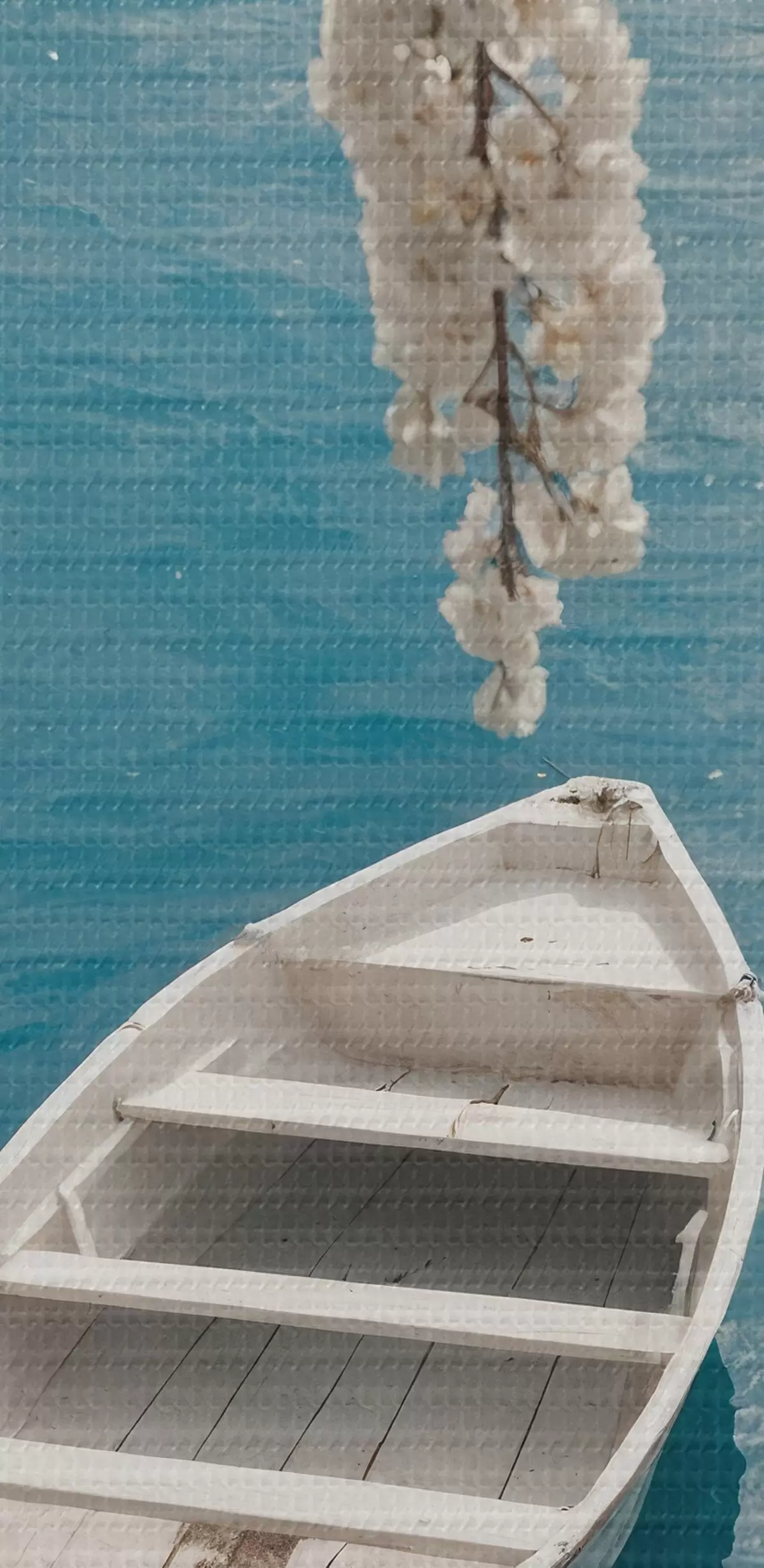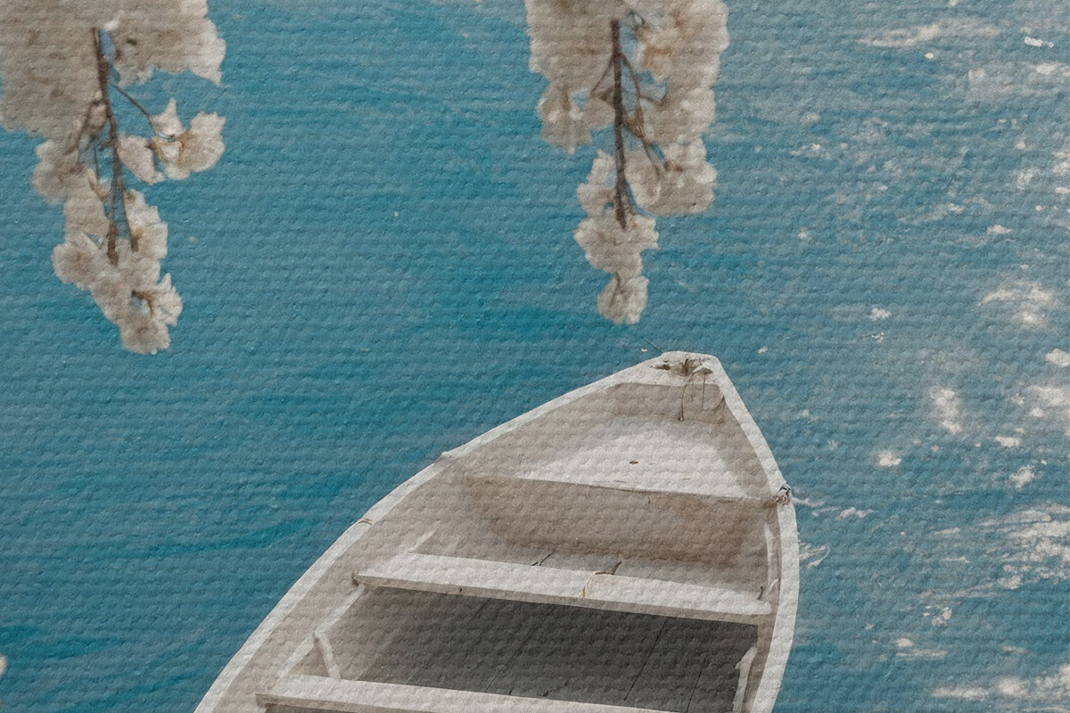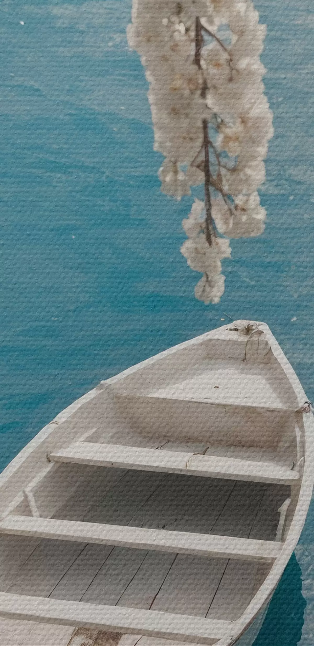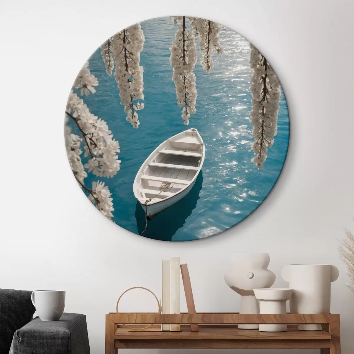 Okrągłe obrazy Biała łódź pod drzewem r44482