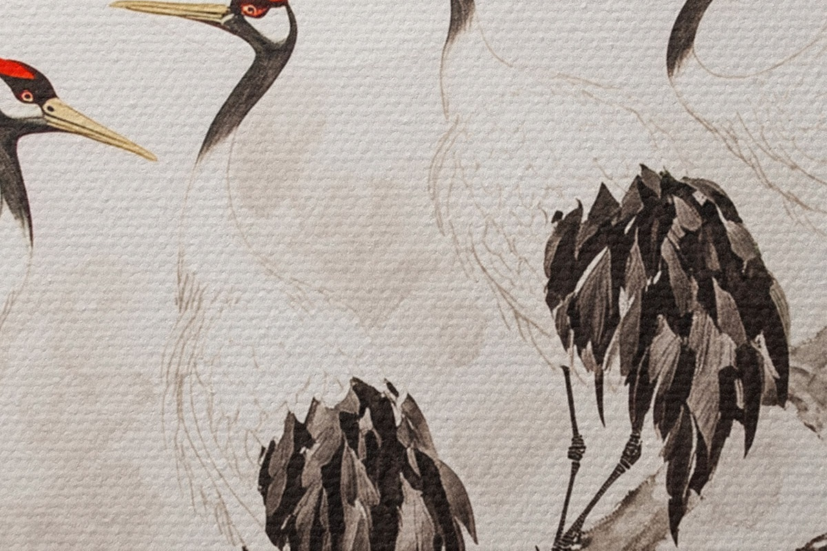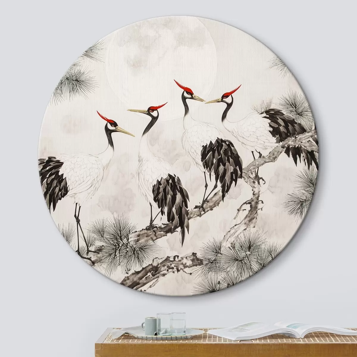Okrągłe obrazy Chińska sztuka z żurawiami i sosnami, styl orientalny, natura r44503
