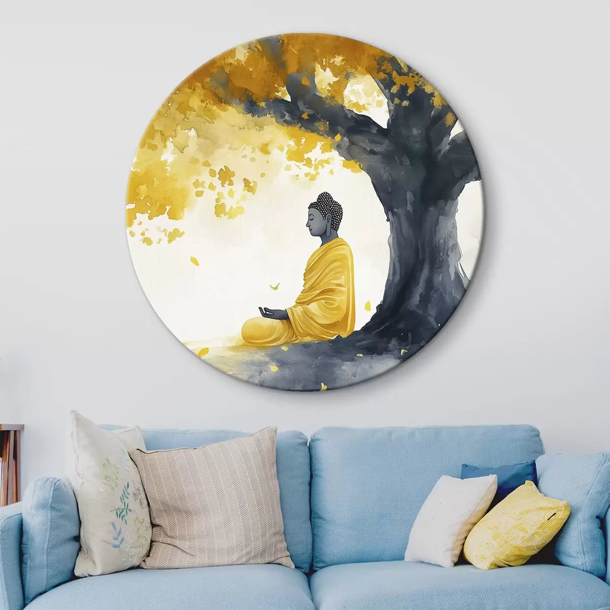 Okrągłe obrazy Medytujący Budda pod drzewem, kolory żółty i szary r44509