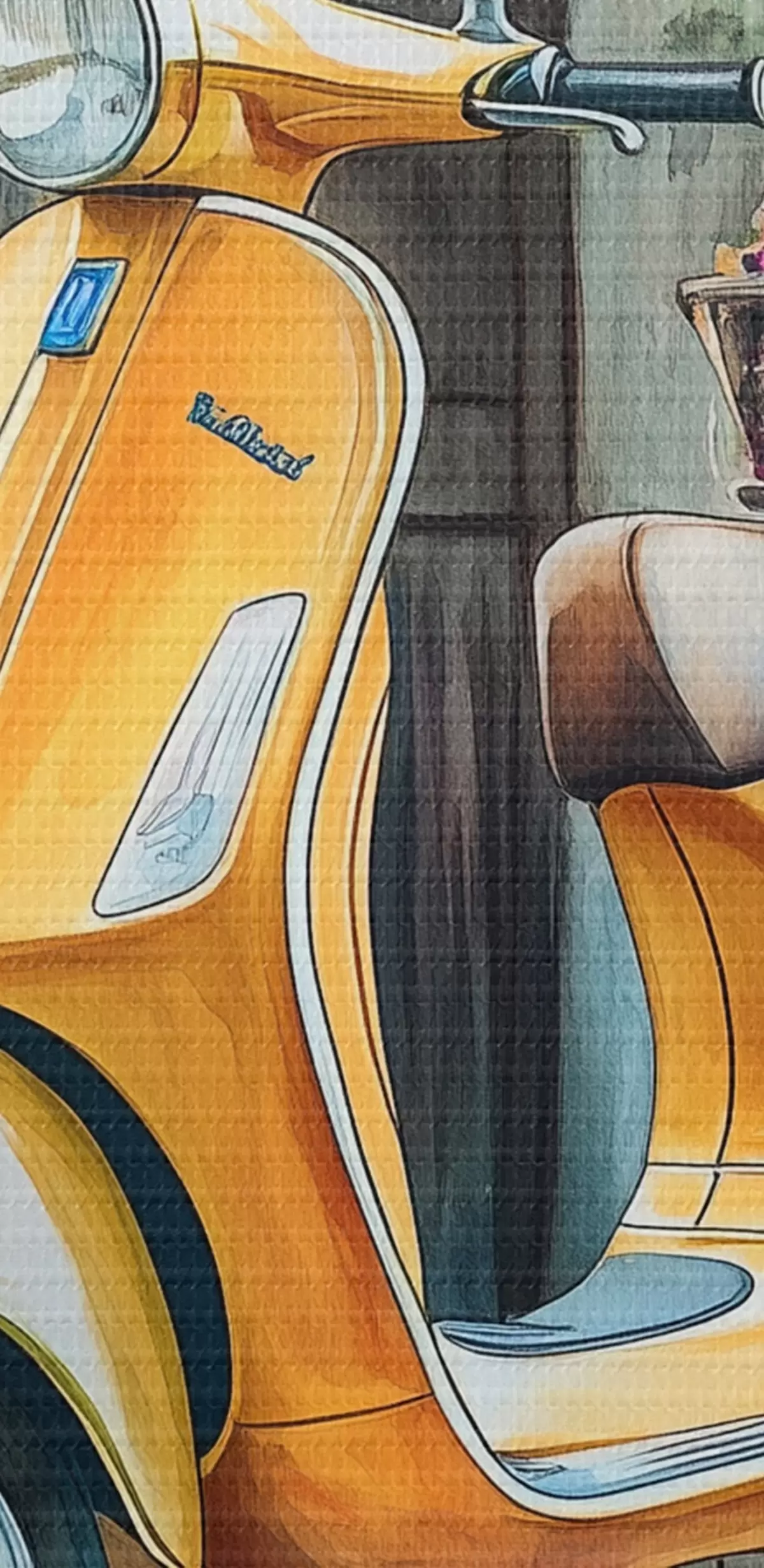 Okrągły obraz Żółty skuter Vespa w pobliżu drewnianych drzwi z kwiatami Nr r44607