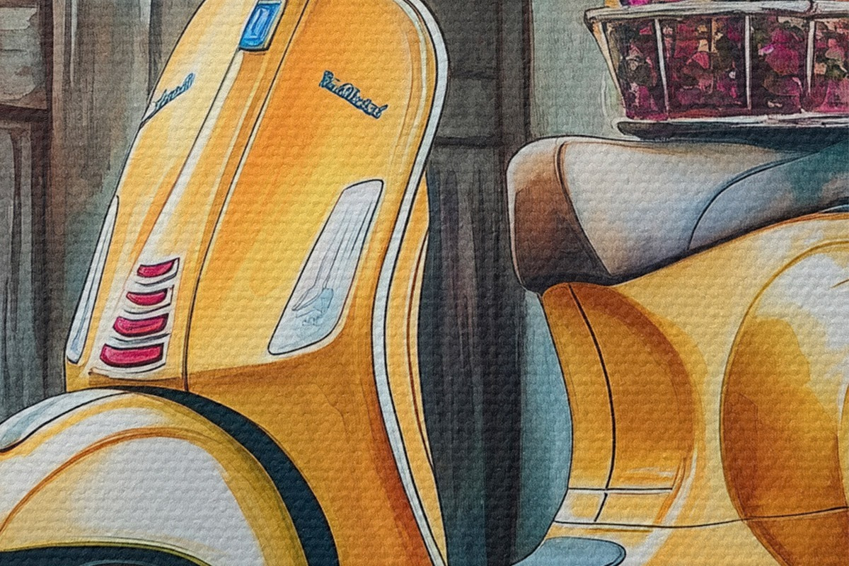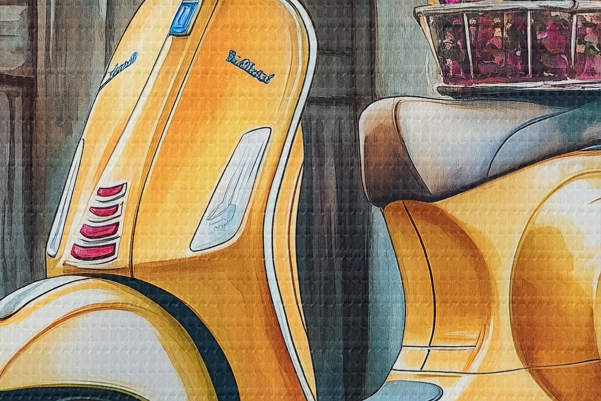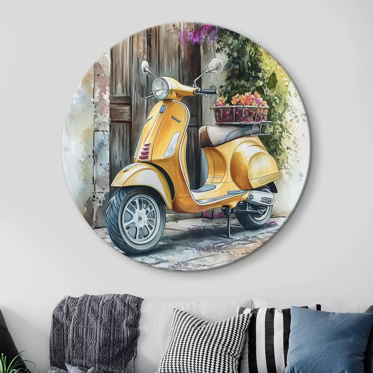 Okrągły obraz Żółty skuter Vespa w pobliżu drewnianych drzwi z kwiatami Nr r44607