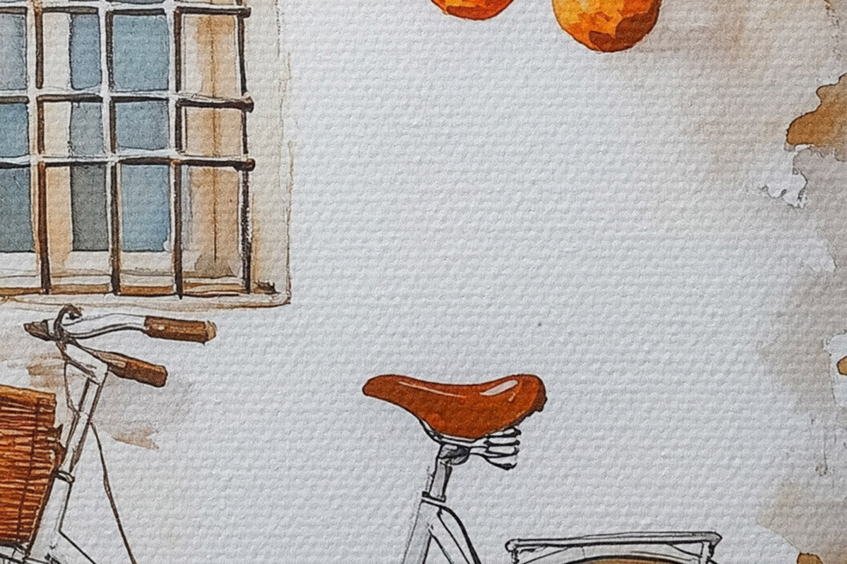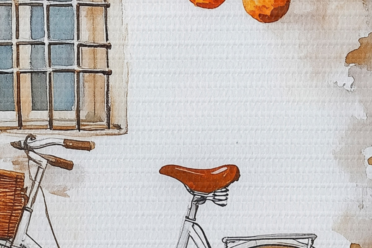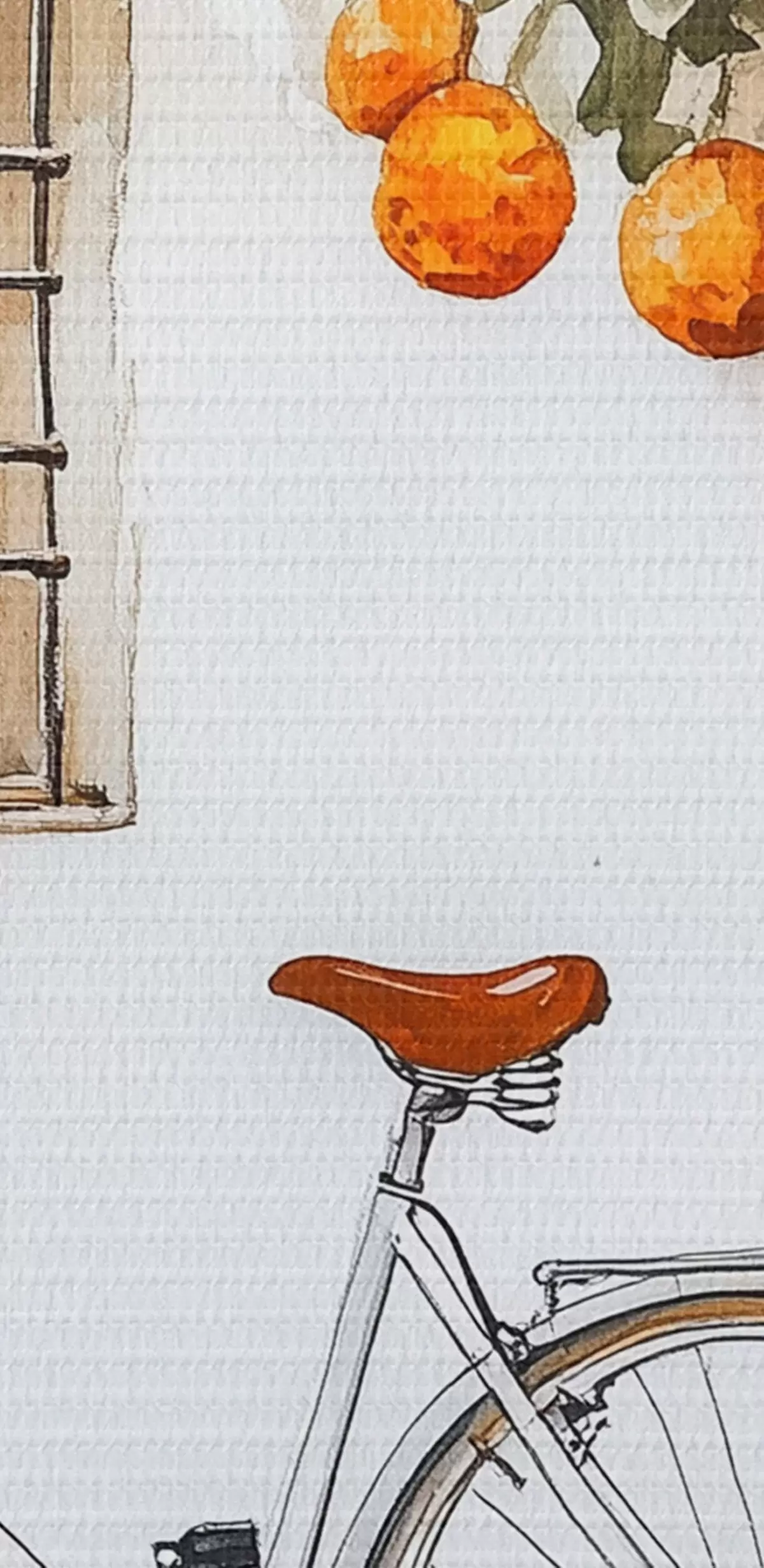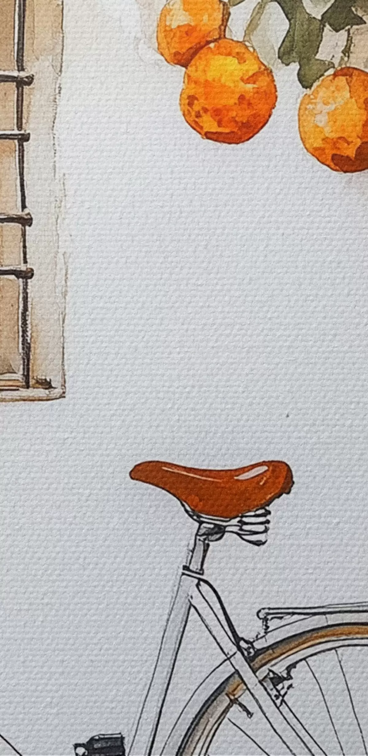 Okrągły obraz Śródziemnomorski biały dom z drzewem pomarańczowym i rowerem Nr r44610