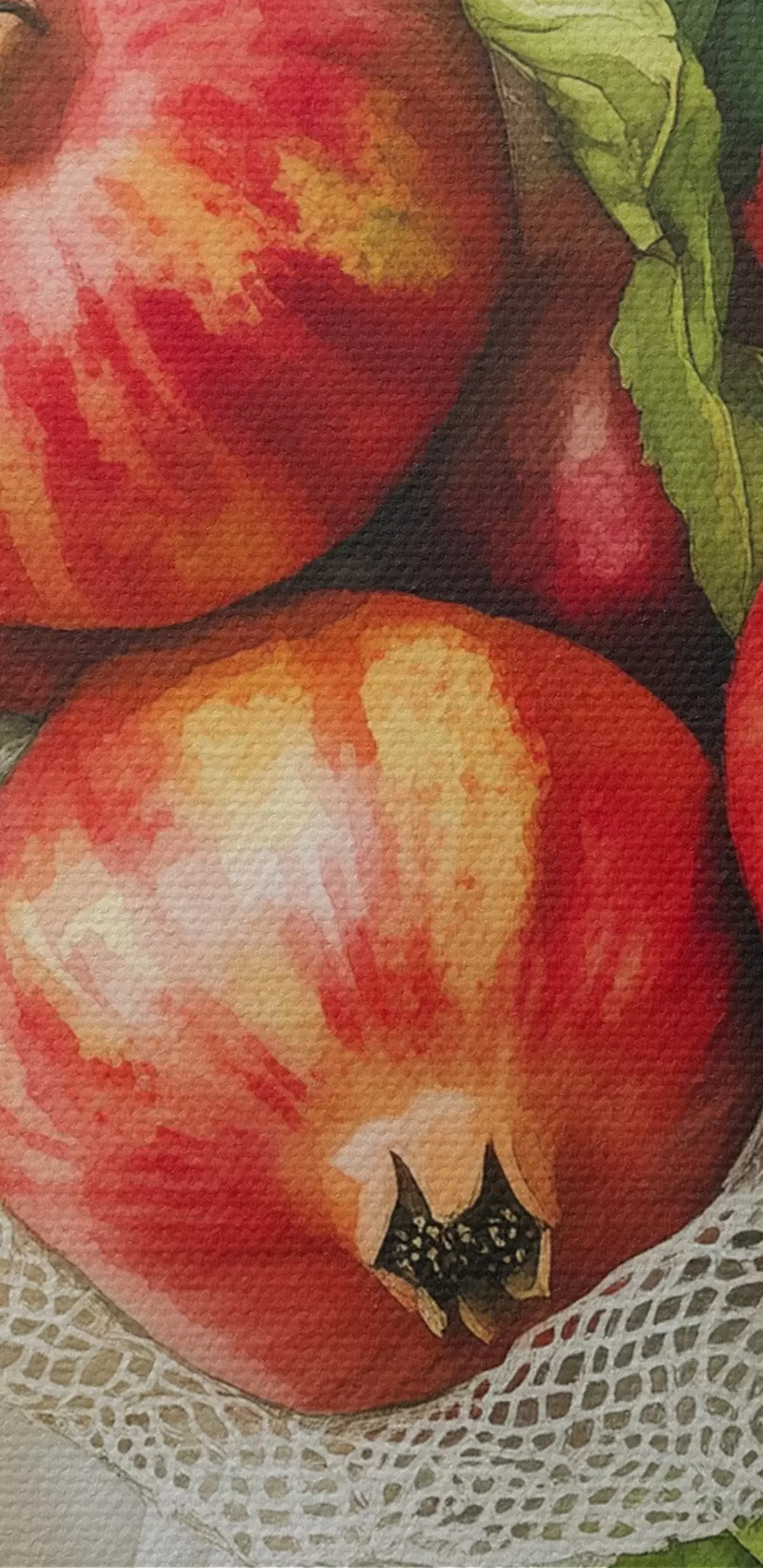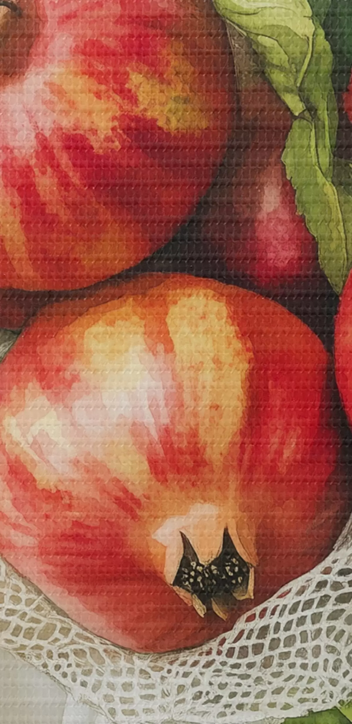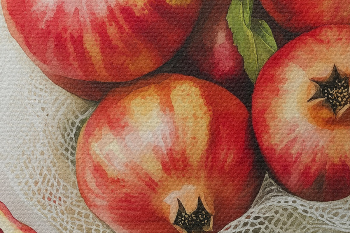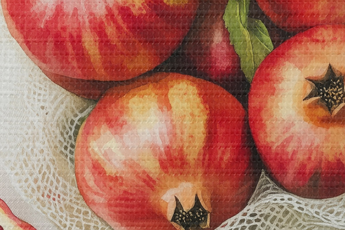 Okrągły obraz Granaty z listkami mięty na lnianych obrusach, styl rustykalny Nr r44611