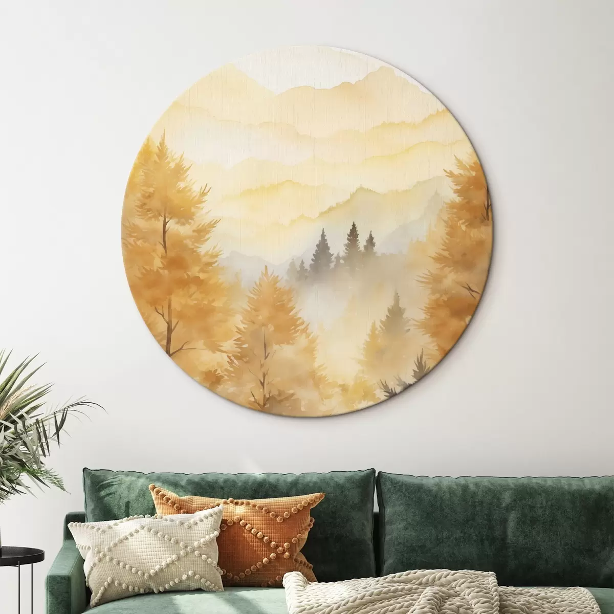 Okrągły obraz Piękny jesienny las z górami w tle Nr r44614
